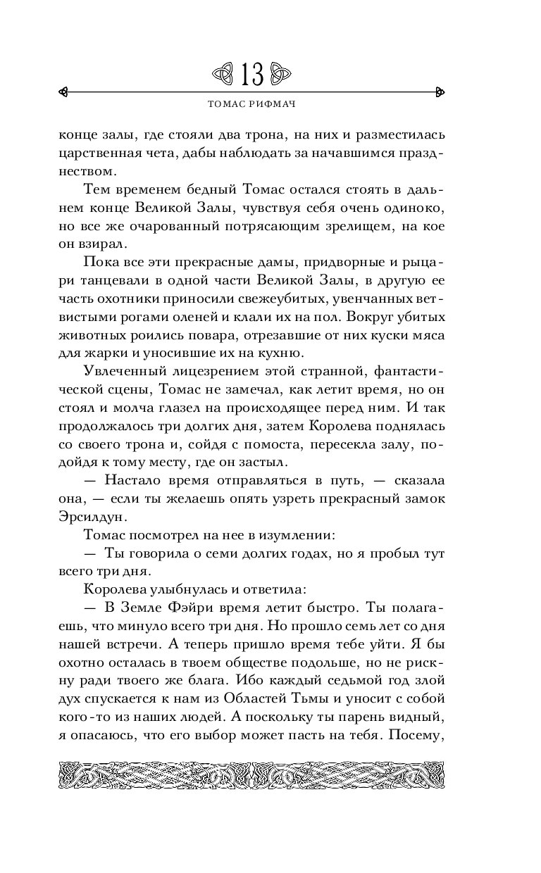 В этой книге собраны истории из разных областей Шотландии о прекрасной стране фей (страна Фэйри), морском народе, эльфах, скале Мерлина, карлике Снорро, ведьме из Файфа, битве птиц и морской деве. Среди героев преданий жители Шотландии и различные представители животного мира острова. Многие предания пропитаны национальным самосознанием шотландцев, а другие хорошо вписываются в общеевропейскую мифологию и мир сказок.