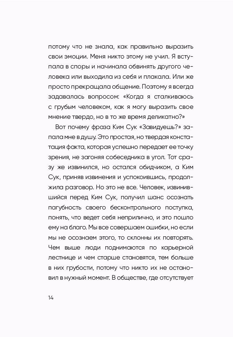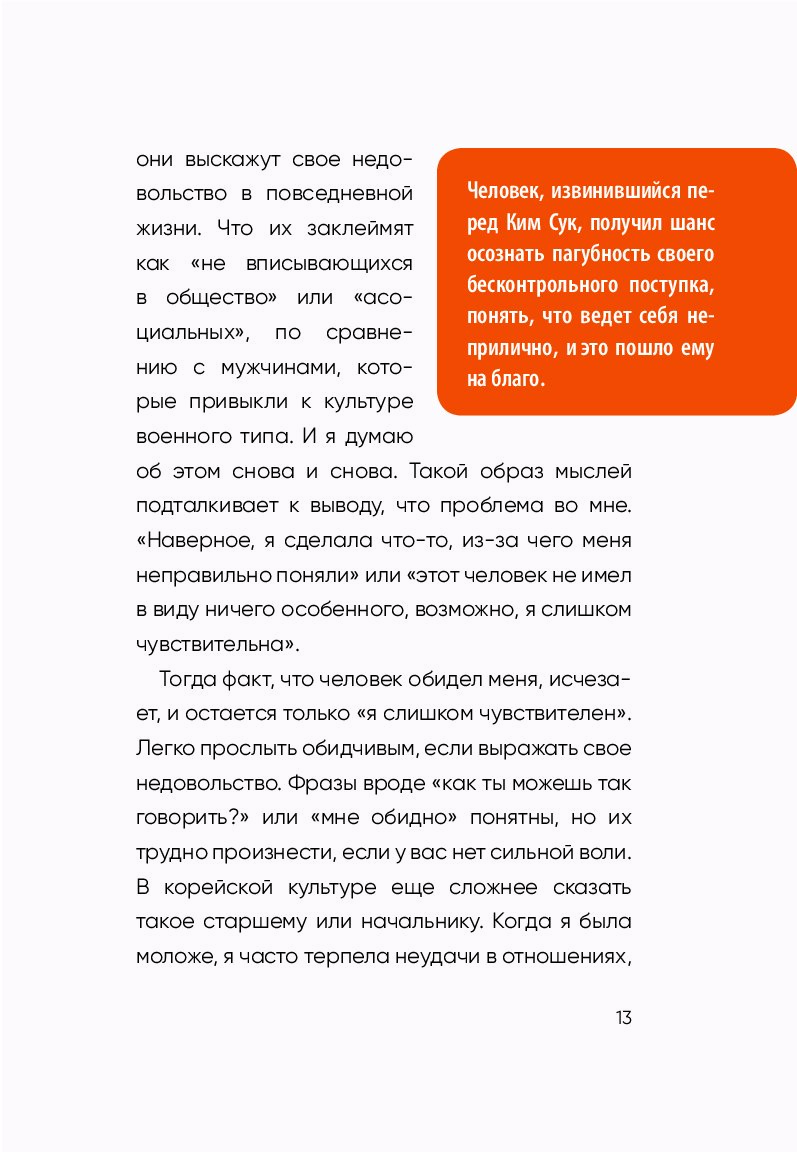 Эта книга, ставшая бестселлером в Южной Корее, — честный и пронзительный разговор о том, как защитить себя. Чон Мунчжон на личном опыте знает, каково это — молча терпеть, а потом ночами прокручивать в голове, «как надо было ответить». Автор научит отстаивать свои границы и не позволять обидчику пользоваться вами.