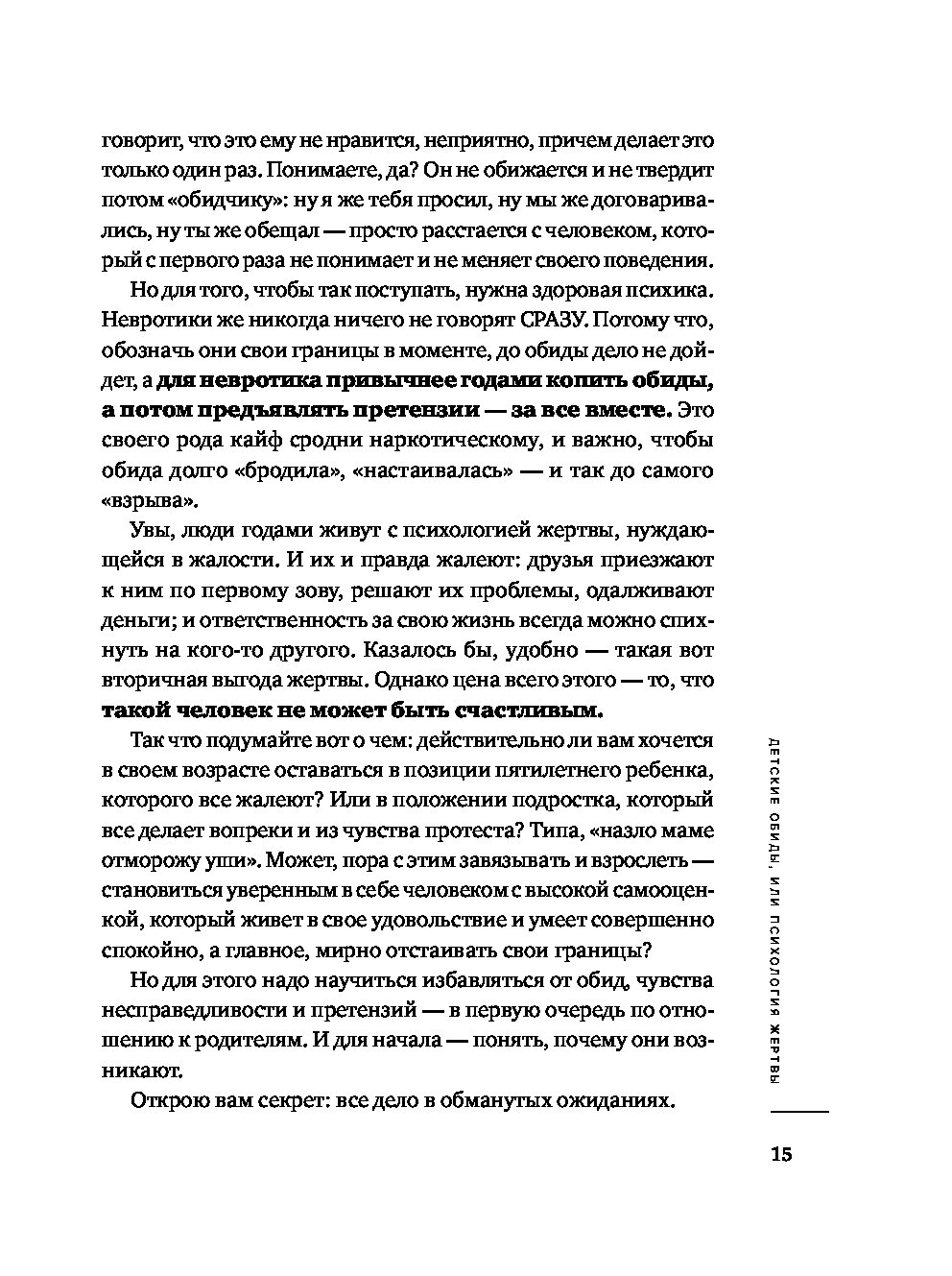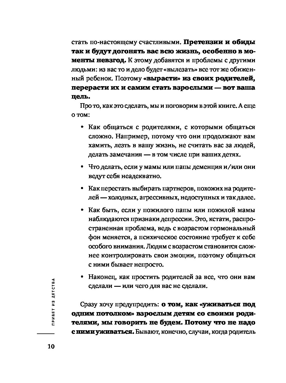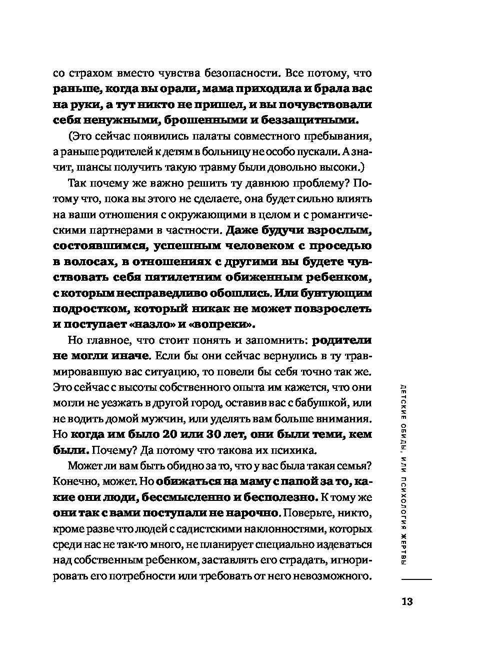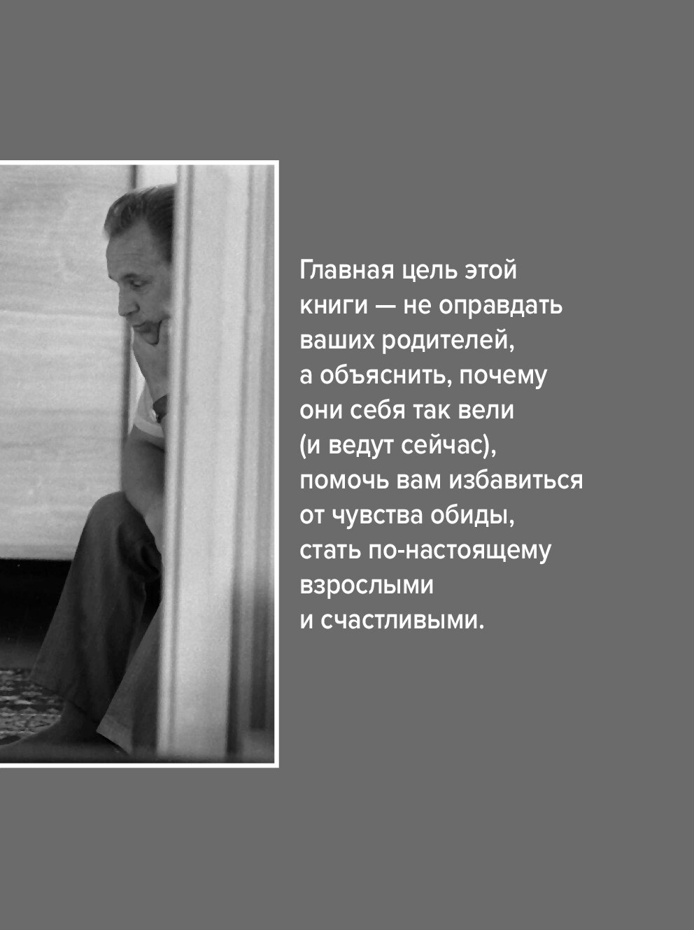 Автор книги уверен: нанесенные в детстве психологические травмы — как неправильно сросшаяся кость после перелома: идти можно, но медленно и превозмогая боль. Чтобы кость срослась правильно, придется вернуться в прошлое, к ситуациям, которые причинили боль, и понять, почему родители так себя вели. И если не получается простить, то хотя бы принять то, что с вами произошло. Ради самих себя, чтобы сбросить груз обид и комплексов, которые мешают расправить плечи и жить смело, легко, а главное — счастливо.