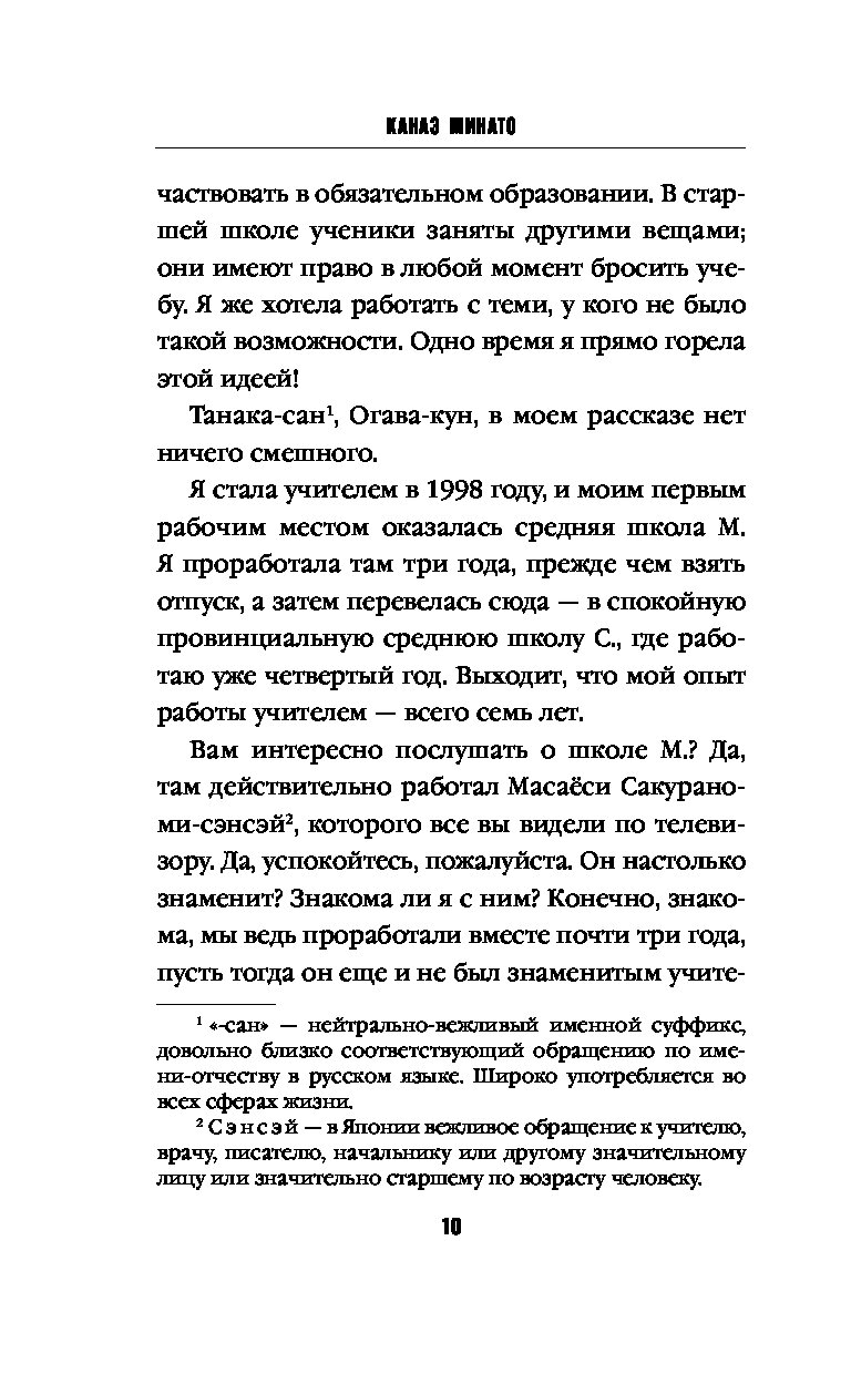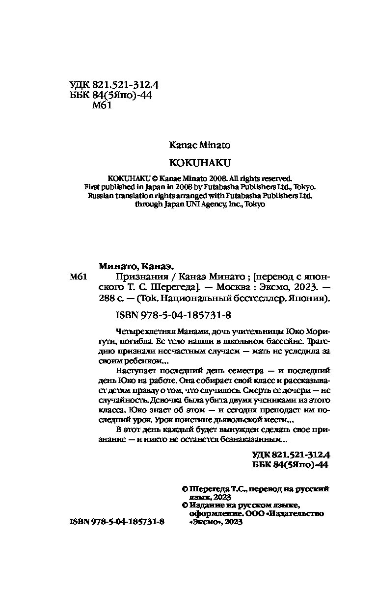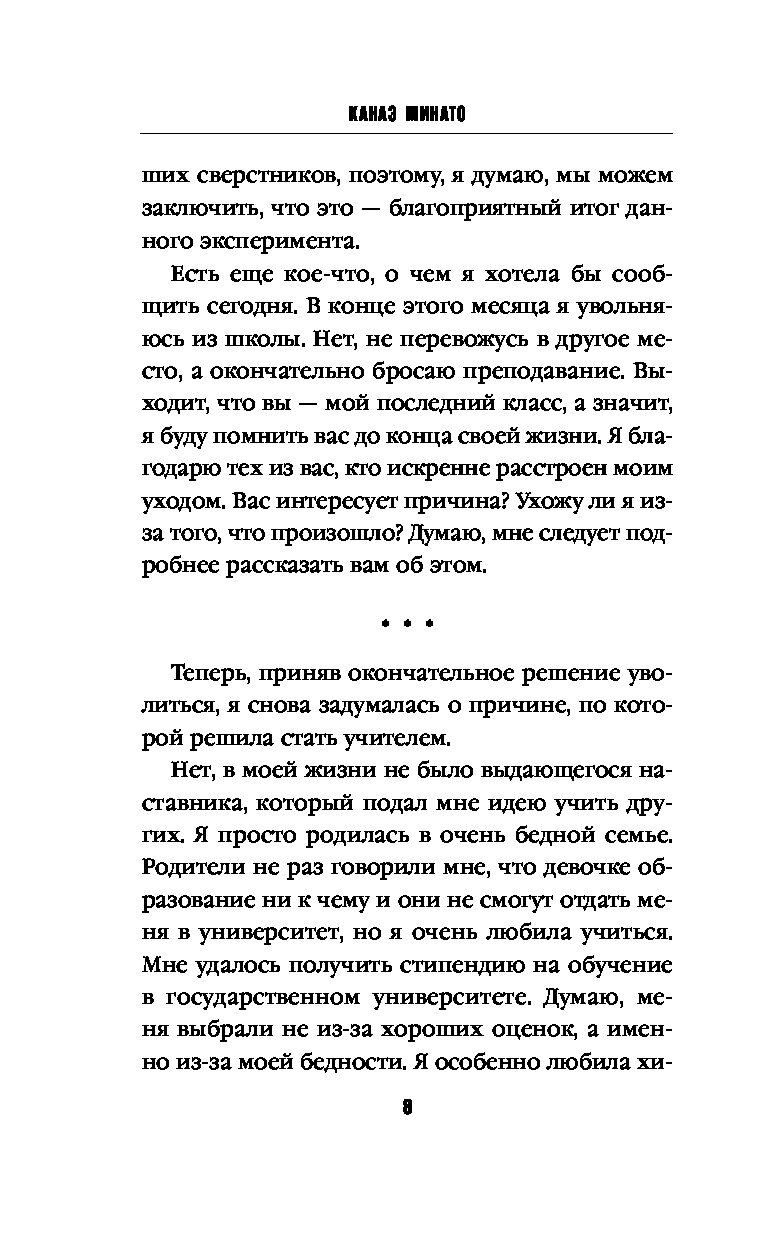 «Как раз когда вы думаете, что знаете, к чему идет дело, Канаэ Минато поднимает очередной занавес, открывая еще одно лицо тайны. Это “Повелитель мух” современного мира». — Дженни Милчман