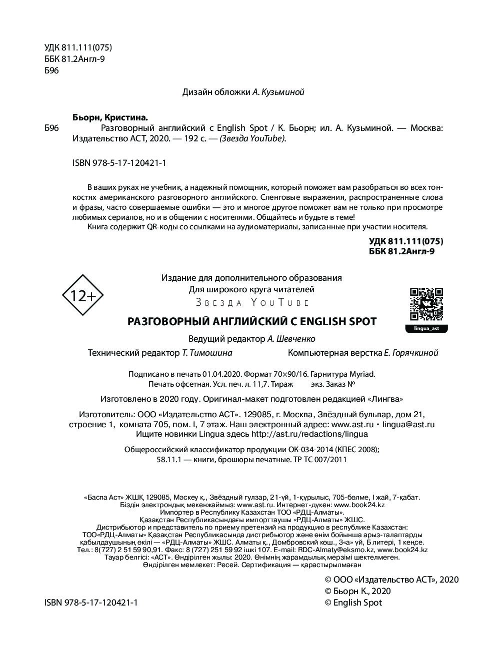 В интернет-магазине Book24.kz можно купить книгу Разговорный английский с English Spot с адресной доставкой по РК. Наш сервис – это прекрасная возможность сэкономить деньги и время, ведь вам не придется искать необходимое издание в обычных книжных магазинах. К тому же, мы предлагаем книгу [название книги] недорого. Доступные цены сохраняем за счет того, что напрямую сотрудничаем с издательствами. Вы без труда можете заказать интересующую книгу в Алматы, Астану, Актау, Актобе, Атырау, Караганду, Кокшетау, Костанай, Кызылорду, Павлодар, Петропавловск, Талдыкорган, Тараз, Уральск, Усть-Каменогорск, Шымкент, и другие города. Чтобы оформить заказ, нужно связаться с нашим менеджером по телефону или заполнить заявку онлайн.