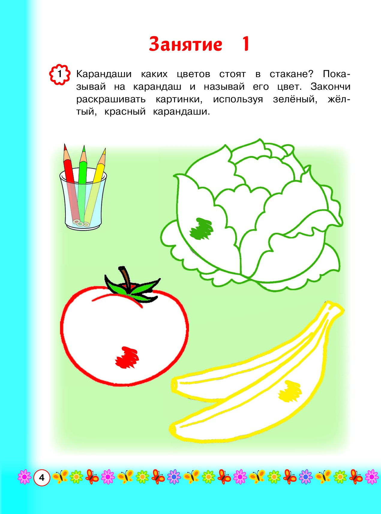 Игровые задания, представленные в книге, ориентированы на реальные возможности детей 3—4 лет и расположены в определённой логической последовательности. В книге в доступной и занимательной форме используются разнообразные упражнения, которые не дадут скучать малышу и помогут сформировать у малышей интерес к выполнению графических заданий, научить их раскрашивать, обводить, дорисовывать картинки. В процессе работы ребёнок познакомится с цветами (жёлтый, красный, зелёный, синий, голубой, оранжевый, фиолетовый); будет рисовать короткие и длинные линии в разных направлениях, прямые и волнистые дорожки; научится ориентироваться на листе (лево, право, перед, между); сможет обвести рисунки по контуру и пунктиру, раскрасить их круговыми движениями (подготовка к рисованию спиралей и петель).