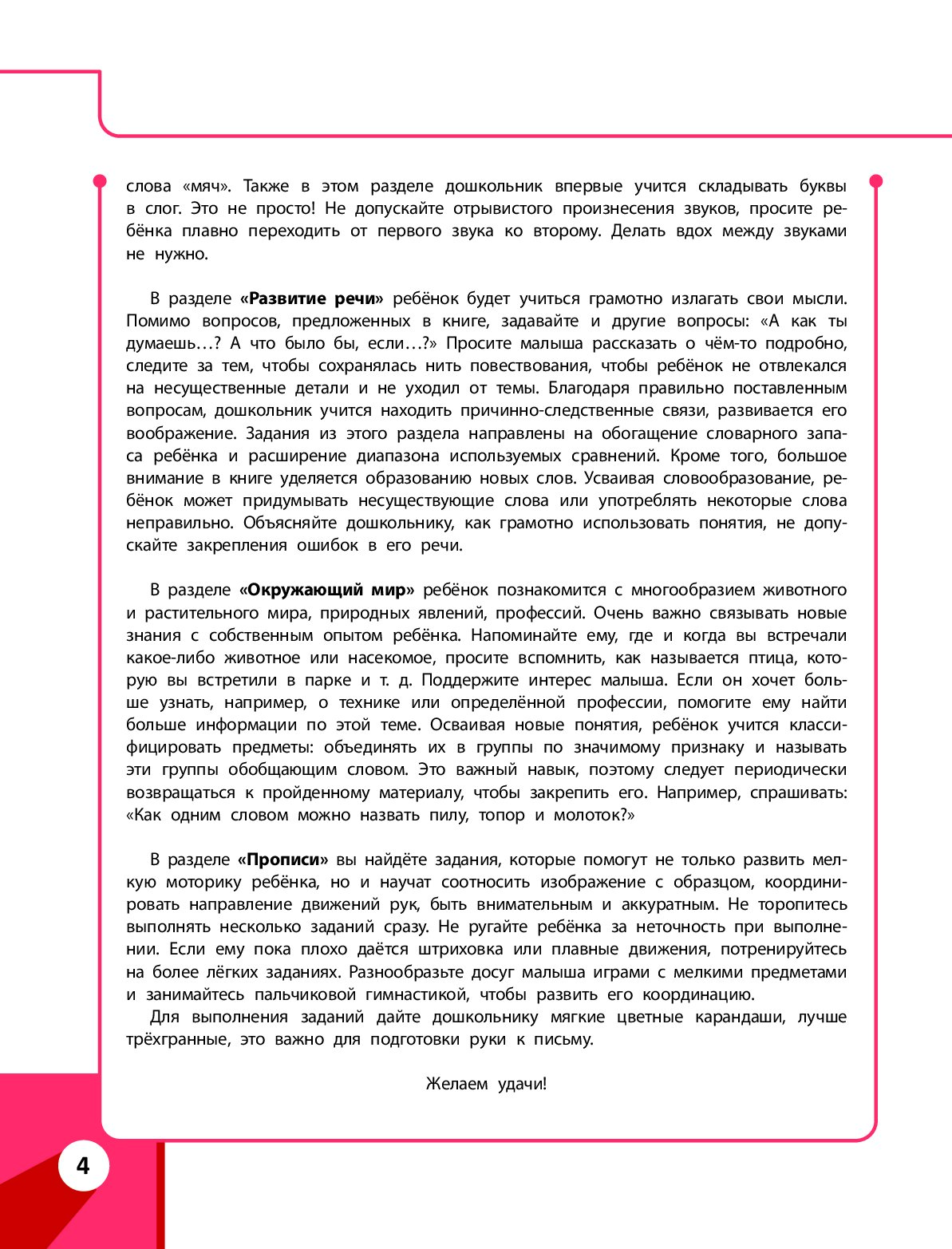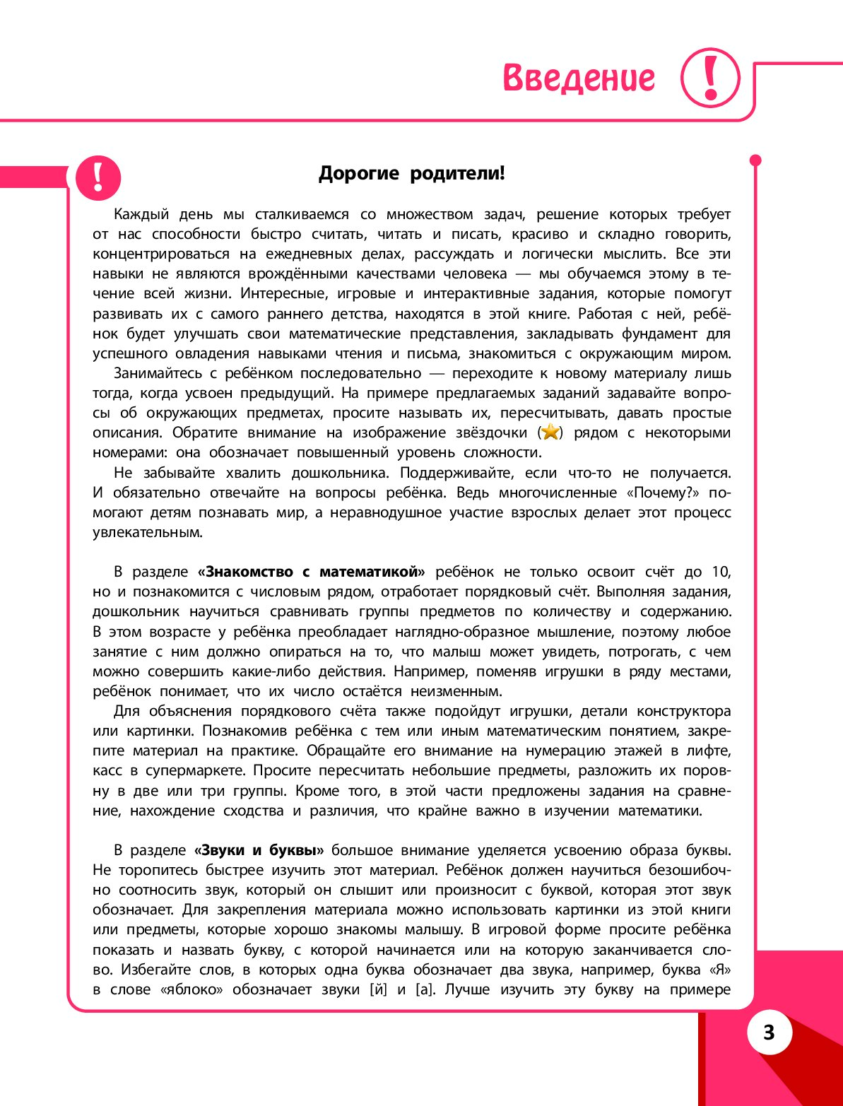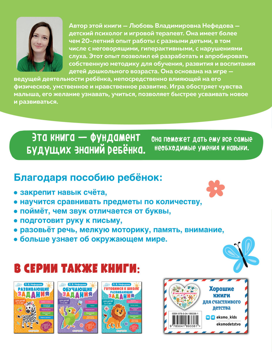 Автор книги, соответствующей ФГОС, — детский психолог с более чем 20-летним опытом работы с детьми разного уровня. В основе методики по дошкольной подготовке лежит игра как основной, понятный и мотивирующий вид деятельности ребенка. С помощью увлекательных заданий родители смогут наиболее эффективно организовать развивающие занятия с малышом. Занимаясь, дошкольник поймет, чем звук отличается от буквы и как образовываются слоги, что поможет заложить основы грамотности; потренирует навык счета; будет сравнивать предметы по количеству; расширит представления о животных, растениях, морских обитателях, птицах, насекомых, временах года, профессиях, транспорте, мебели, посуде; узнает о правилах поведения на дороге, сможет развить графические навыки, внимание, память, речь. В пособии широко используется принцип наглядности, поэтому книга полна ярких иллюстраций, которые заинтересуют дошкольника и вызовут желание заниматься. Формулировки просты и понятны, а значит, родителям не придется подыскивать нужные слова, чтобы объяснить ребенку алгоритм выполнения упражнений — учиться по книге легко и приятно. В процесс работы и взрослые, и дети получат только положительные эмоции. Малыш станет более уверенным в себе, а главное, положительно настроенным к обучению. Книга издательства «Эксмо» станет отличным подарком любому мальчику или девочке.