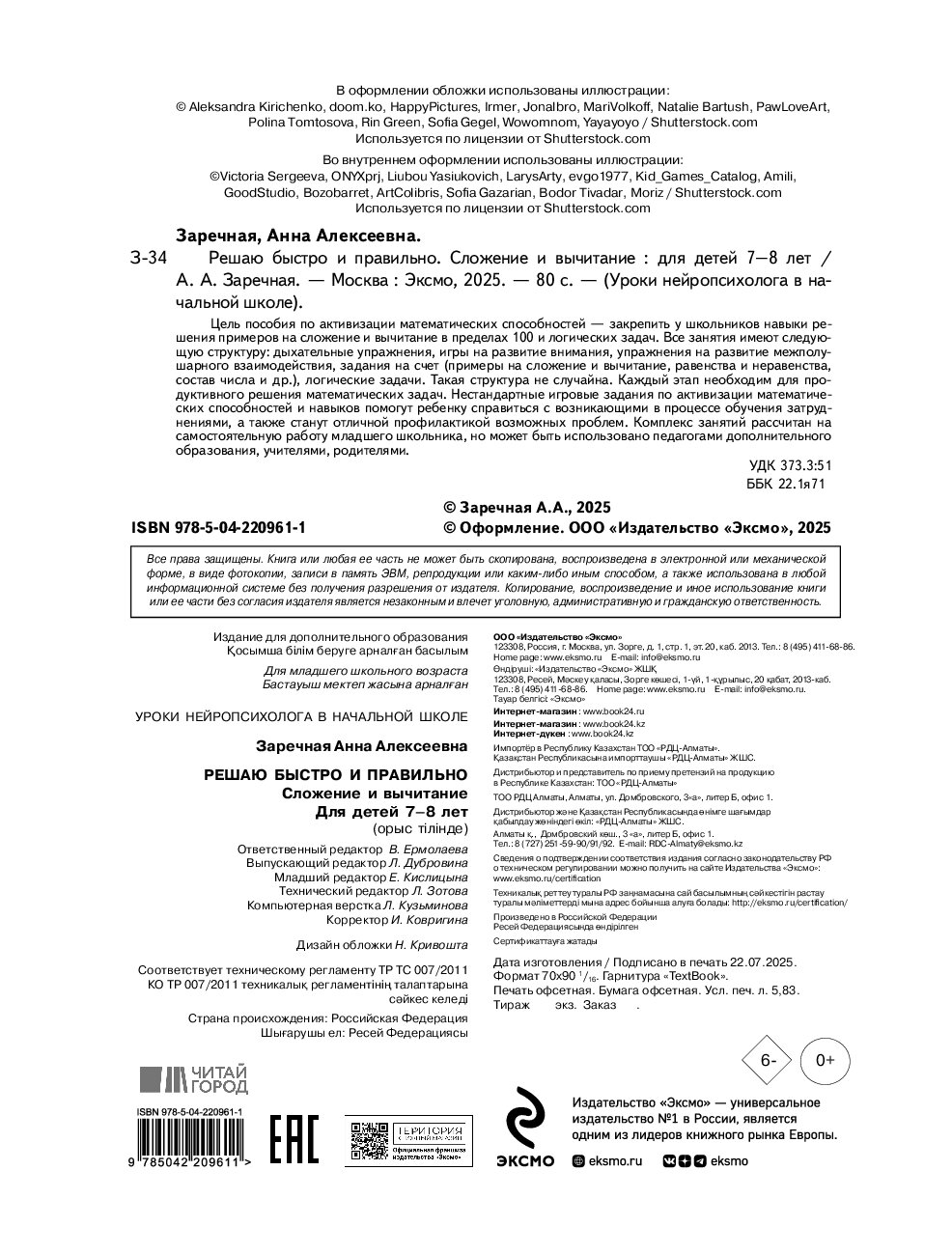 — «Решаю быстро и правильно. Сложение и вычитание: для детей 7-8 лет» Заречная А.А.