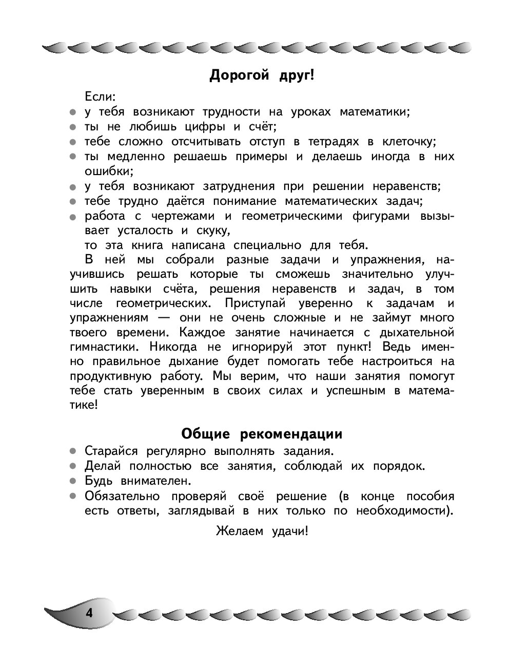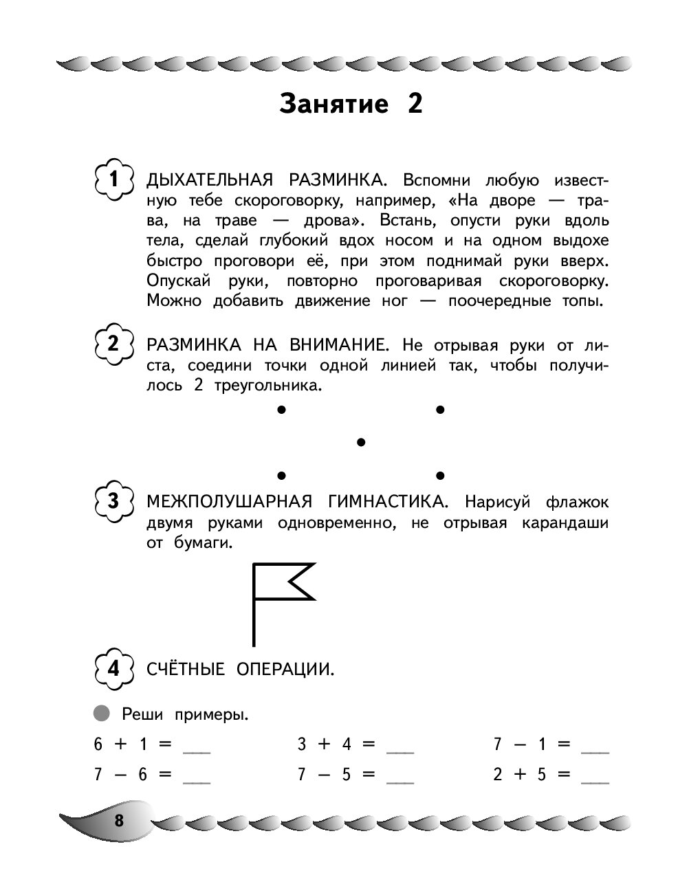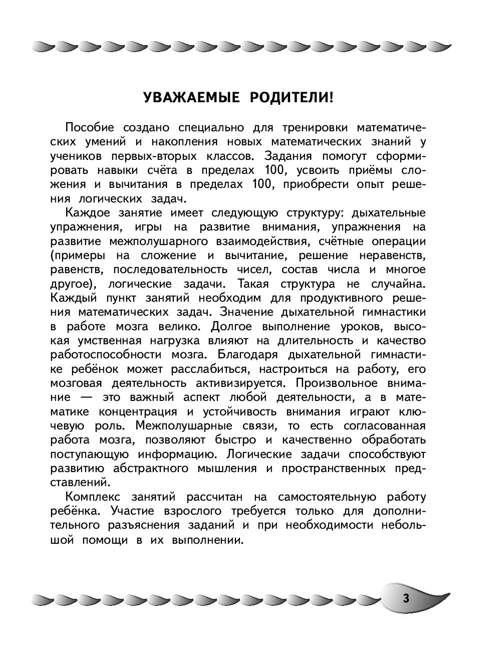 Пособие по активизации математических способностей подготовлено практикующим нейропсихологом, преподавателем НИЦ Детской нейропсихологии имени А. Р. Лурия, который каждый день помогает учащимся начальной школы справиться с возникающими проблемами в обучении. Цель книги — формирование и закрепление у детей навыков счёта, приёмов сложения и вычитания в пределах 100, приобретения опыта решения логических задач. В каждом занятии, кроме примеров на сложение и вычитание, неравенств и равенств, заданий на состав числа и составление последовательностей, решения логических задач, даются ещё и дыхательные упражнения, игры на развитие внимания и межполушарного взаимодействия, что позволит быстро и качественно обрабатывать поступающую информацию. Вопросы и задания в разделах выстроены в определенном порядке, который помогает активизировать механизмы соответствующих отделов мозга. Использование пособия по активизации математических способностей в учебном процессе или в качестве дополнительного материала позволит ребенку своевременно устранить всевозможные сложности в усвоении школьной программы и формировании необходимых навыков. Кроме того, в серию "Уроки нейропсихолога в начальной школе" входят книги: "Развитие разных видов памяти и внимания: для детей 8-10 лет", "Исправление почерка и профилактика дисграфии: для детей 8-10 лет", "Развитие навыка грамотного письма: для детей 9-10 лет", "Пишу без ошибок. Развитие орфографической зоркости: для детей 9-10 лет",  Развитие математических способностей и навыков: для детей 9-10 лет", "Говорю грамотно. Развитие речевого потенциала: для детей 8-10 лет".