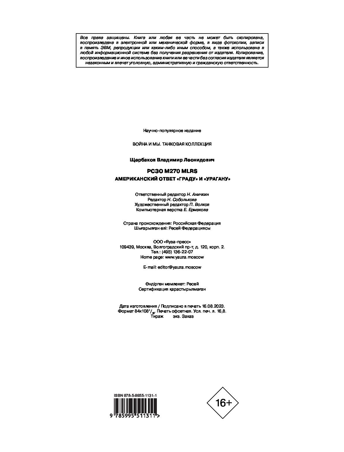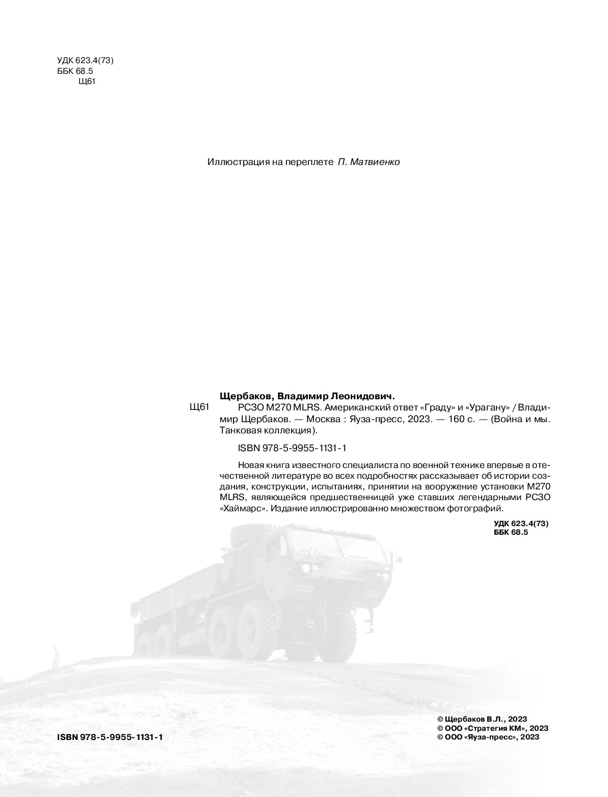Новая книга известного специалиста по военной техники впервые в отечественной литературе во всех подробностях рассказывает об истории создания, конструкции, испытаниях, принятии на вооружение установки М270 MLRS, являющейся предшественницей уже ставших легендарными РСЗО «Хаймарс».
