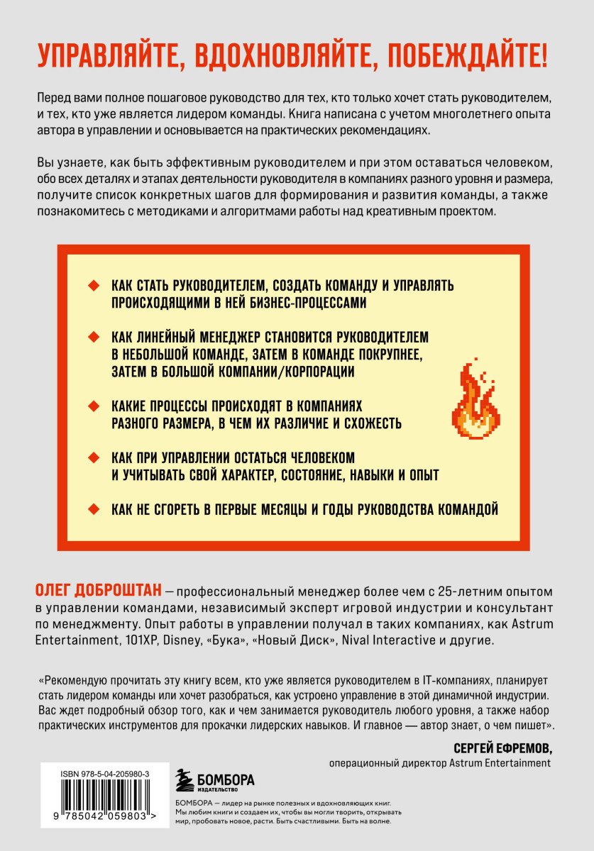 Эта книга — практическое руководство по развитию навыков руководителя в IT-компаниях, подходящее как для начинающих, так и для опытных лидеров. Автор делится своим многолетним опытом и предлагает конкретные рекомендации о том, как эффективно управлять командой, сохраняя при этом человечность. Читатели узнают о ключевых этапах руководства, методах работы над креативными проектами и способах избежать выгорания. Книга будет полезна не только представителям IT-индустрии, но и всем, кто стремится стать успешным руководителем.