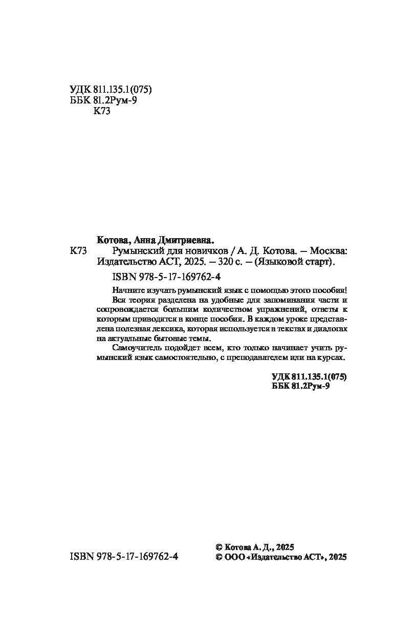 В интернет-магазине Book24.kz можно заказать и купить книгу Румынский для новичков недорого с адресной доставкой по Казахстану. Воспользовавшись нашим сервисом, Вам не придется долго ждать заказ. В течение 1-9 дней товар доставляется в любой город – Актау, Актобе, Атырау, Караганду, Кокшетау, Костанай, Кызылорду, Павлодар, Петропавловск, Талдыкорган, Тараз, Уральск, Усть-Каменогорск, Шымкент, Алматы, Астану и другие. У нас на сайте можно просмотреть фото, ознакомиться с кратким содержанием книги и отзывами читателей. Предлагаем выгодные условия продажи: доступные цены, оперативную доставку. Все книги в наличии.