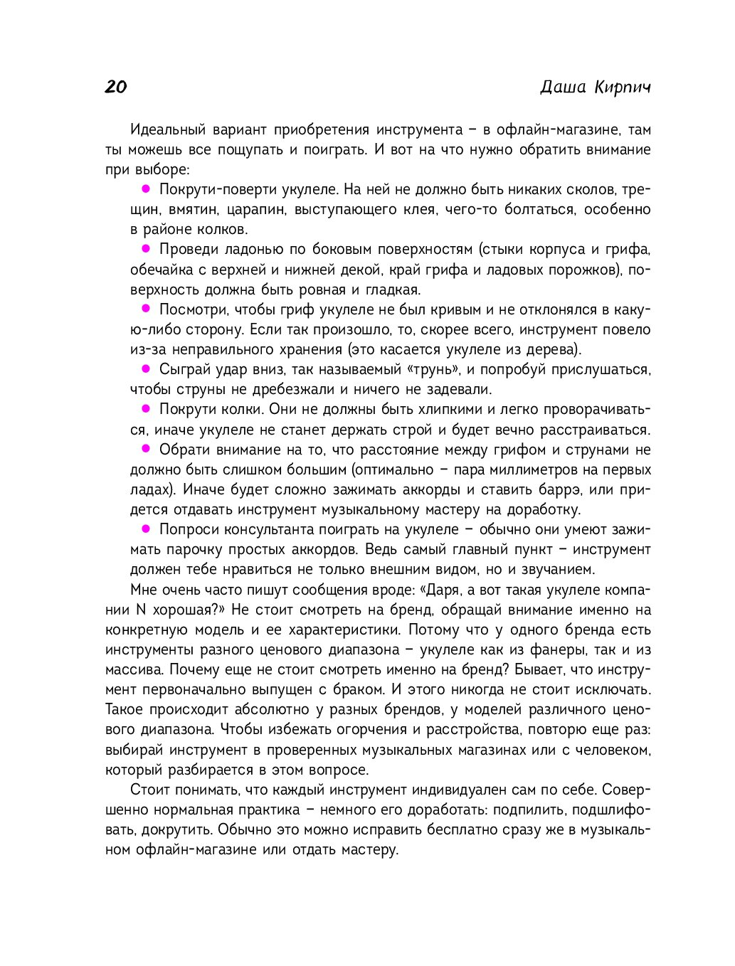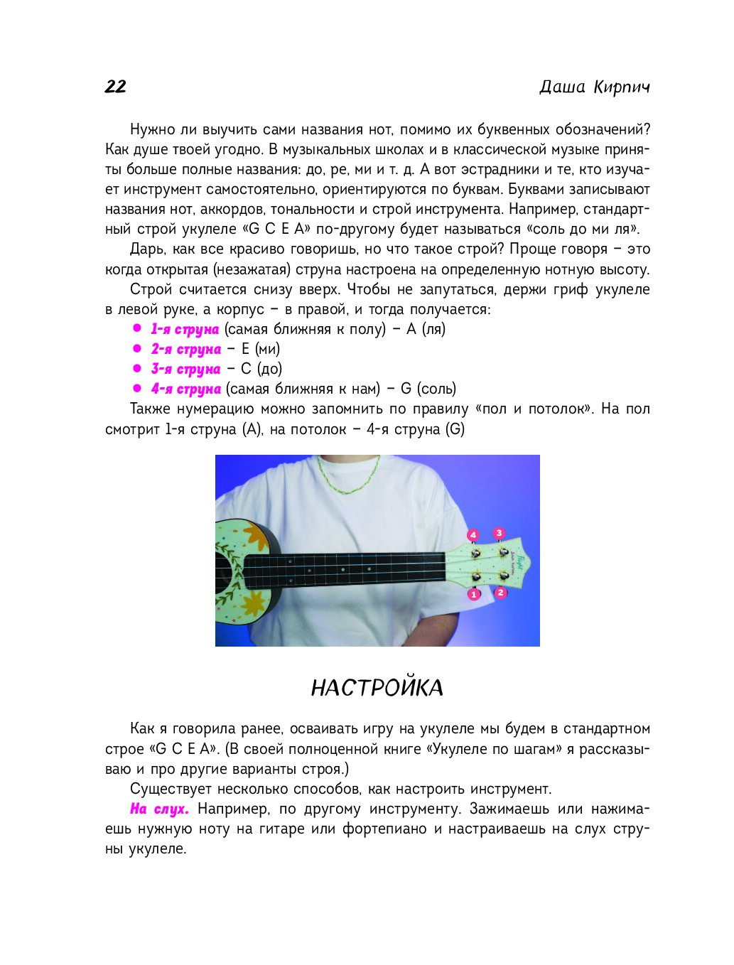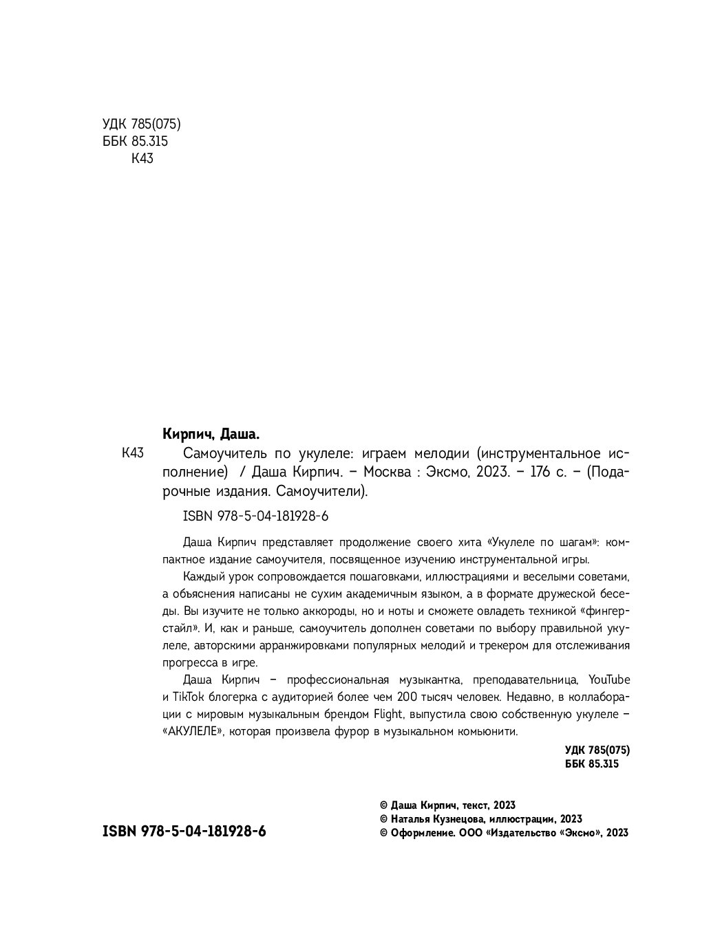 Профессиональная музыкантка, блогерка и преподавательница Даша Кирпич расскажет тебе, как легко и быстро освоить инструментальную игру на укулеле. После изучения этой книги ты не только разучишь аккорды и ноты, но и узнаешь азы музыкальной теории, изучишь расположение нот на инструменте и выучишь сложные техники, баррэ, переборы и т.д. В конце книги, как и раньше, находятся словарь терминов и укутрекер для отслеживания прогресса.