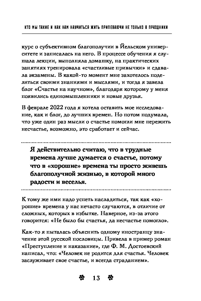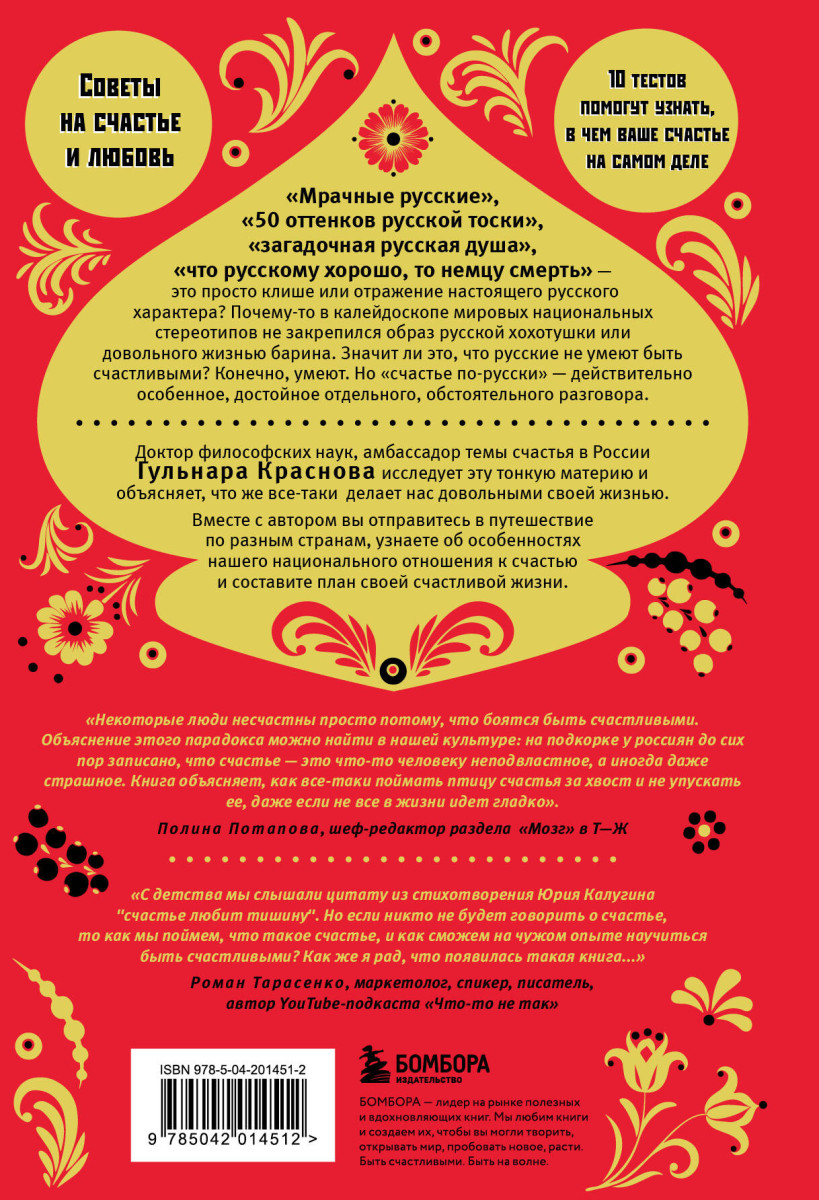 «Некоторые люди несчастны просто потому, что боятся быть счастливыми. Объяснение этого парадокса можно найти в нашей культуре: где-то на подкорке у россиян до сих пор записано, что счастье — это что-то неуловимое, человеку неподвластное, а иногда даже страшное. Книга с опорой на исследования объясняет, как все-таки поймать птицу счастья за хвост и не упускать ее, даже если не все в жизни идет гладко». — Полина Потапова, шеф-редактор раздела «Мозг» в Т—Ж