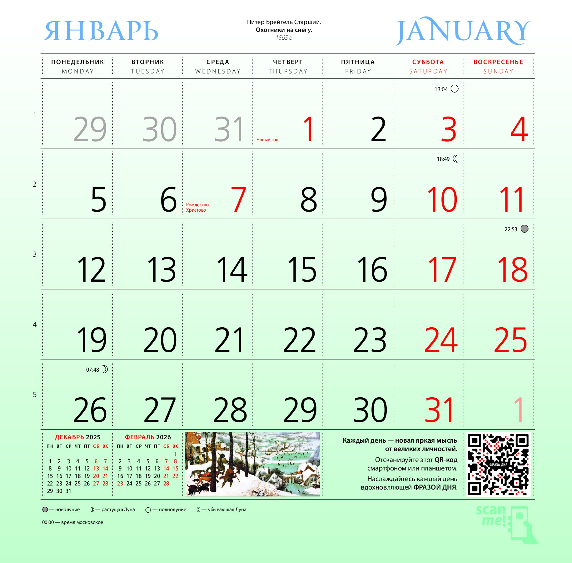 В этом настенном перекидном календаре на 2026 год представлены знаменитые картины великих художников из эпохи Ренессанса. Повесьте этот календарь в своем доме или на рабочем месте, и он достойно украсит любой интерьер. А календарный блок напомнит о важных событиях года. В центре календаря помещен большой арт-постер, который может стать отдельным декоративным украшением интерьера.