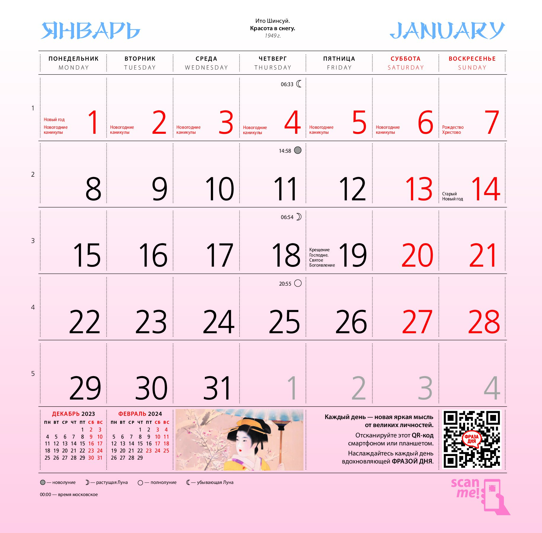 Наши настенные календари отличаются высоким качеством исполнения! Тщательно подобранные иллюстрации, напечатанные на глянцевой бумаге высочайшего качества, станут настоящим украшением дома, а в календарной сетке найдется место для ваших планов: большие клетки позволят делать записи и организовать свой год! В календаре также отмечены все государственные праздники.