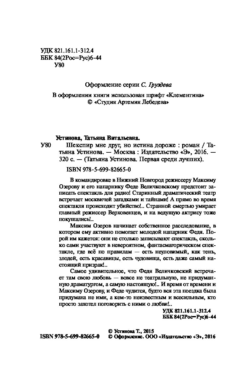 О книге: Татьяна Устинова в своем уникальном авторском стиле погружает читателя в мир провинциального театра. Для служителей Мельпомены зависть, коварство и несчастная любовь – явления привычные. Но убийство в стенах театра – событие экстраординарное. А в том, что в жестоком преступлении повинен кто-то из «своих», сомневаться не приходится…