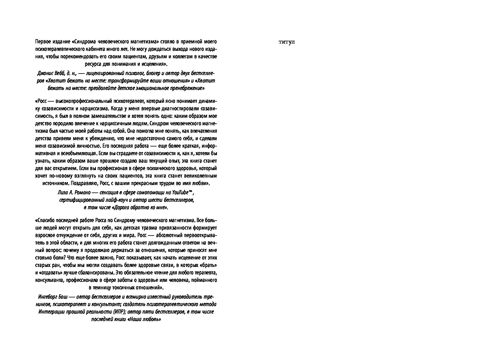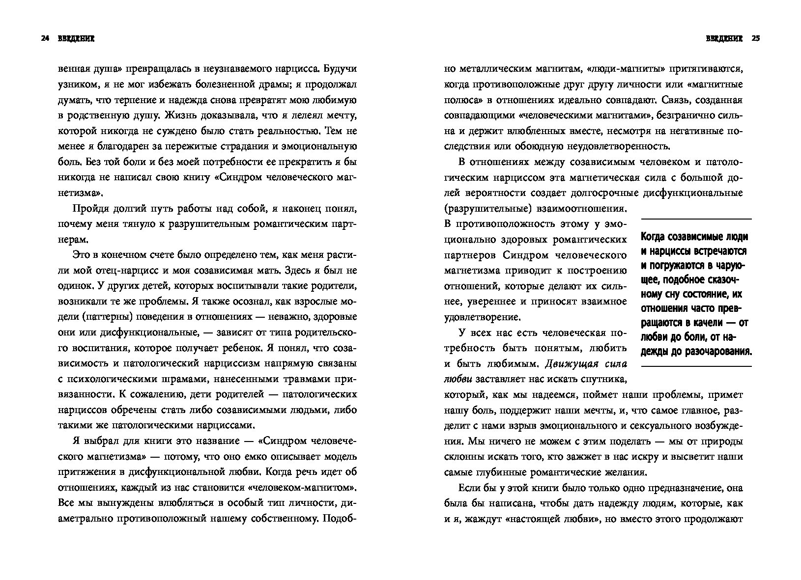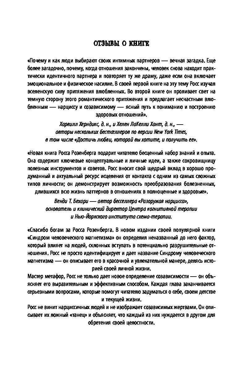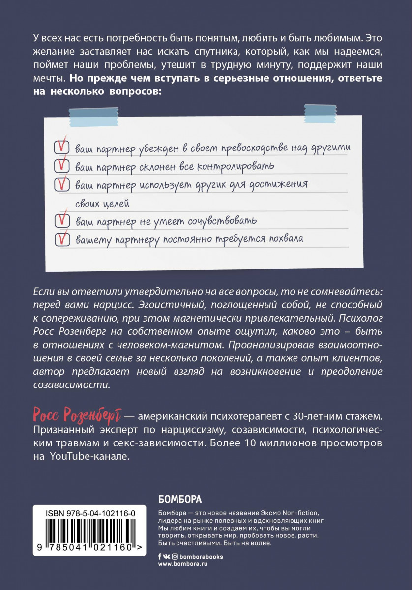 Если вы ответили утвердительно на все вопросы, то не сомневайтесь перед вами нарцисс. Эгоистичный, поглощенный собой, не способный к сопереживанию, при этом магнетически привлекательный. Психолог Росс Розенберг на собственном опыте ощутил, какого это быть в отношениях с человеком-магнитом. Проанализировав взаимоотношения в своей семье за несколько поколений, а также опыт клиентов, автор предлагает новый взгляд на возникновение и преодоление созависимости.