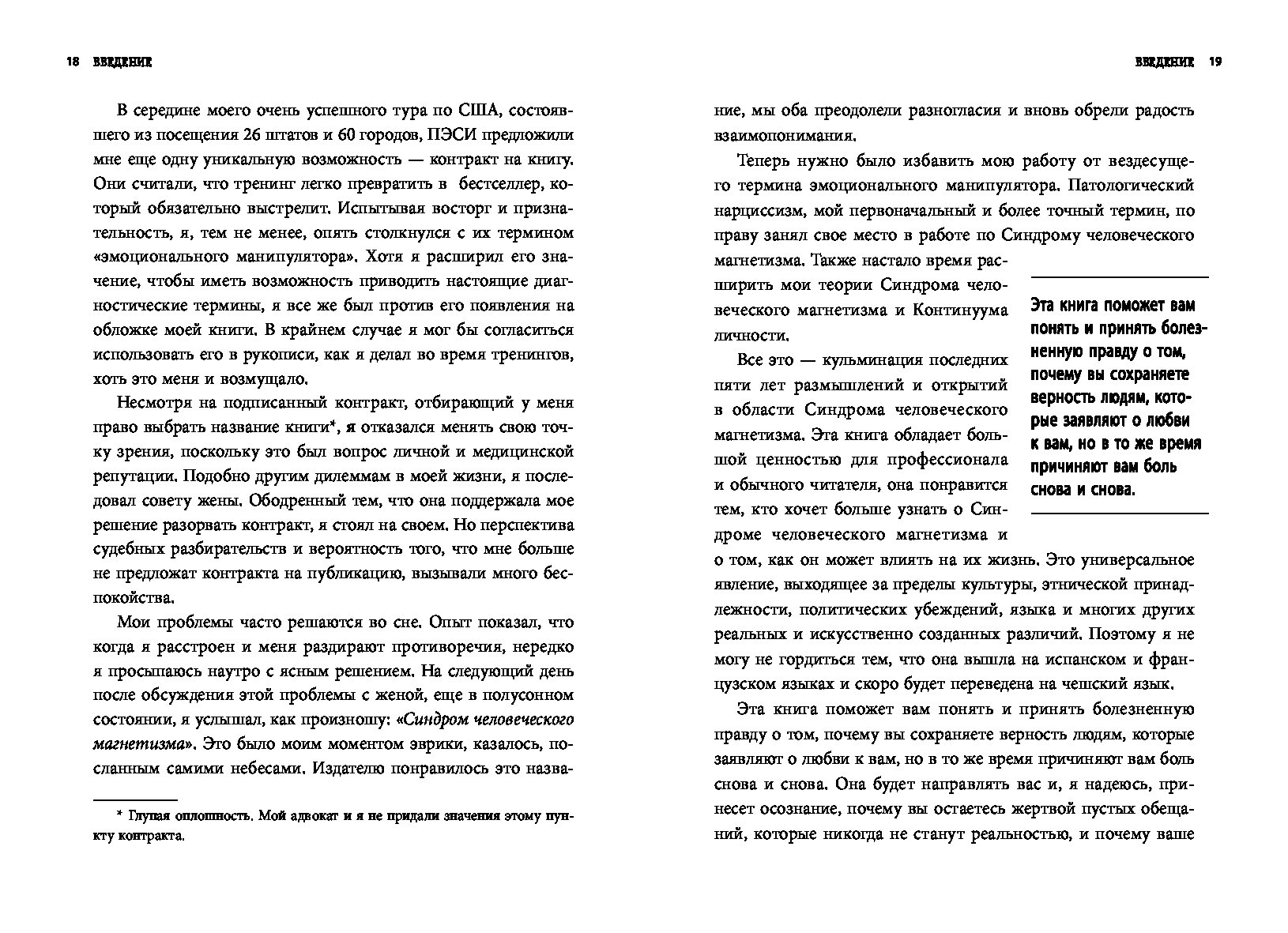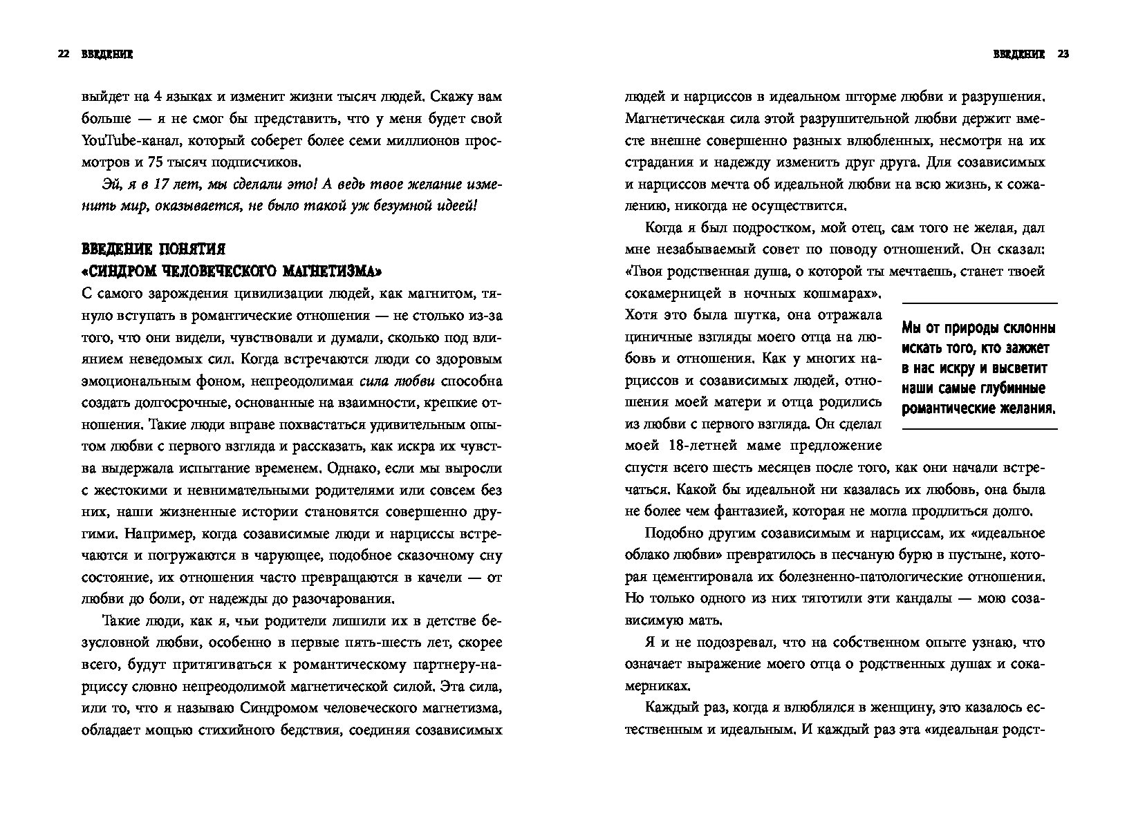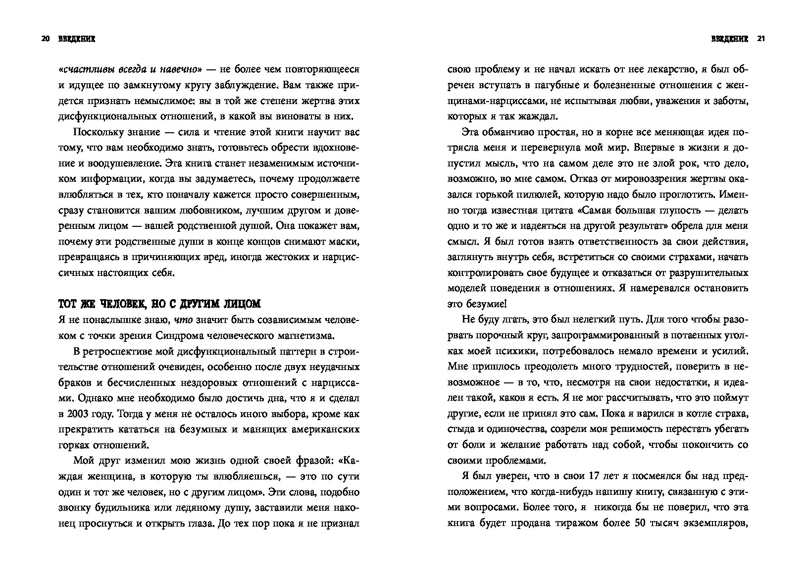 Если вы ответили утвердительно на все вопросы, то не сомневайтесь перед вами нарцисс. Эгоистичный, поглощенный собой, не способный к сопереживанию, при этом магнетически привлекательный. Психолог Росс Розенберг на собственном опыте ощутил, какого это быть в отношениях с человеком-магнитом. Проанализировав взаимоотношения в своей семье за несколько поколений, а также опыт клиентов, автор предлагает новый взгляд на возникновение и преодоление созависимости.