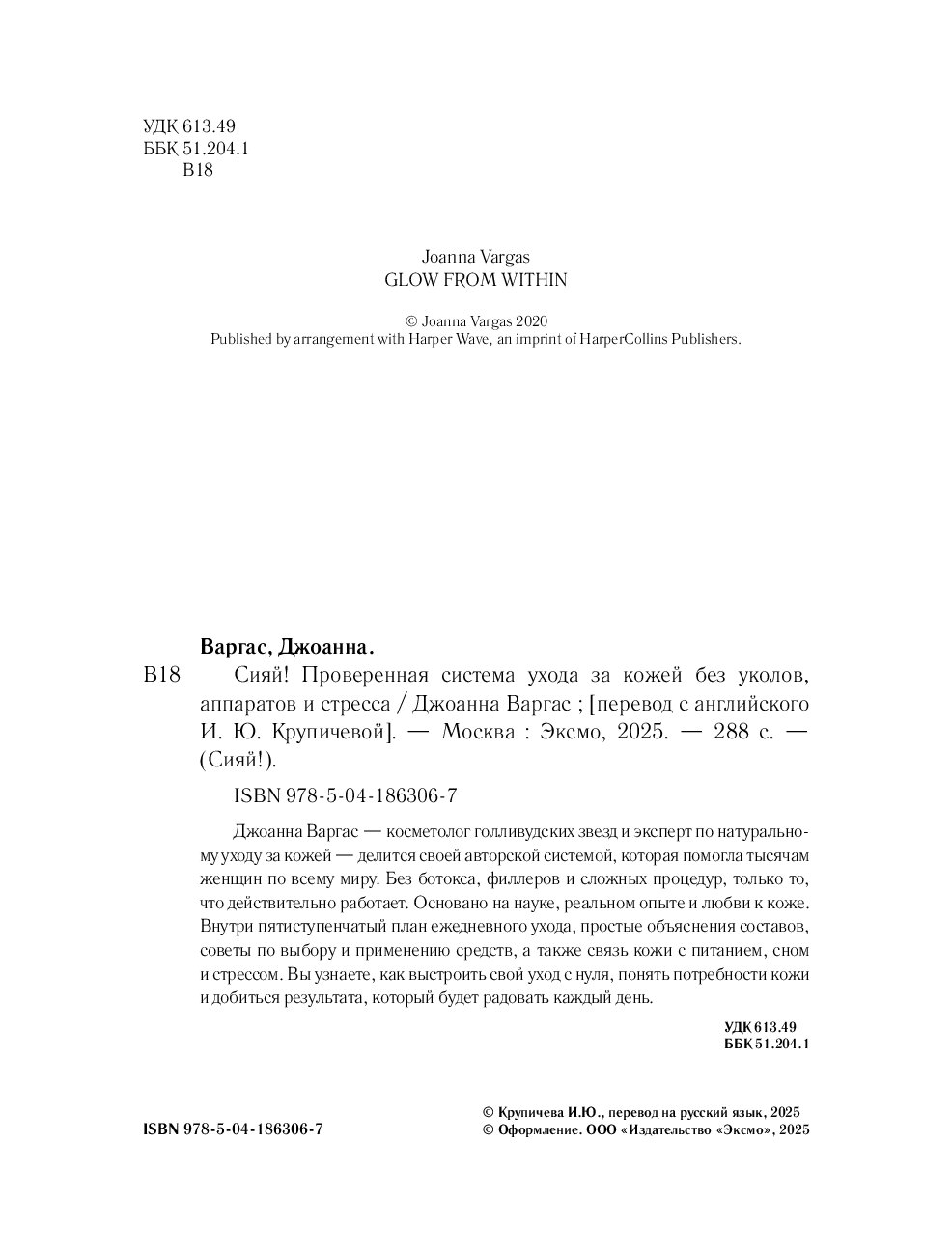 «Сияй!» — практическое руководство по уходу за кожей от Джоанны Варгас, звездного косметолога, которая работает с Джулианной Мур, Софией Копполой, Элизабет Мосс и тысячами женщин по всему миру. Впервые Джоанна делится своей натуральной системой, основанной на научных знаниях, опыте и внимании к каждому этапу жизни кожи.