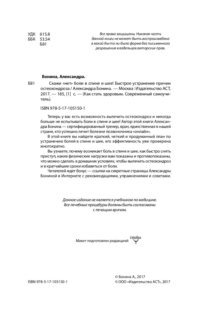 Книга «Скажи "нет" боли в спине и шее! Быстрое устранение причин остеохондроза» Бонина Александра