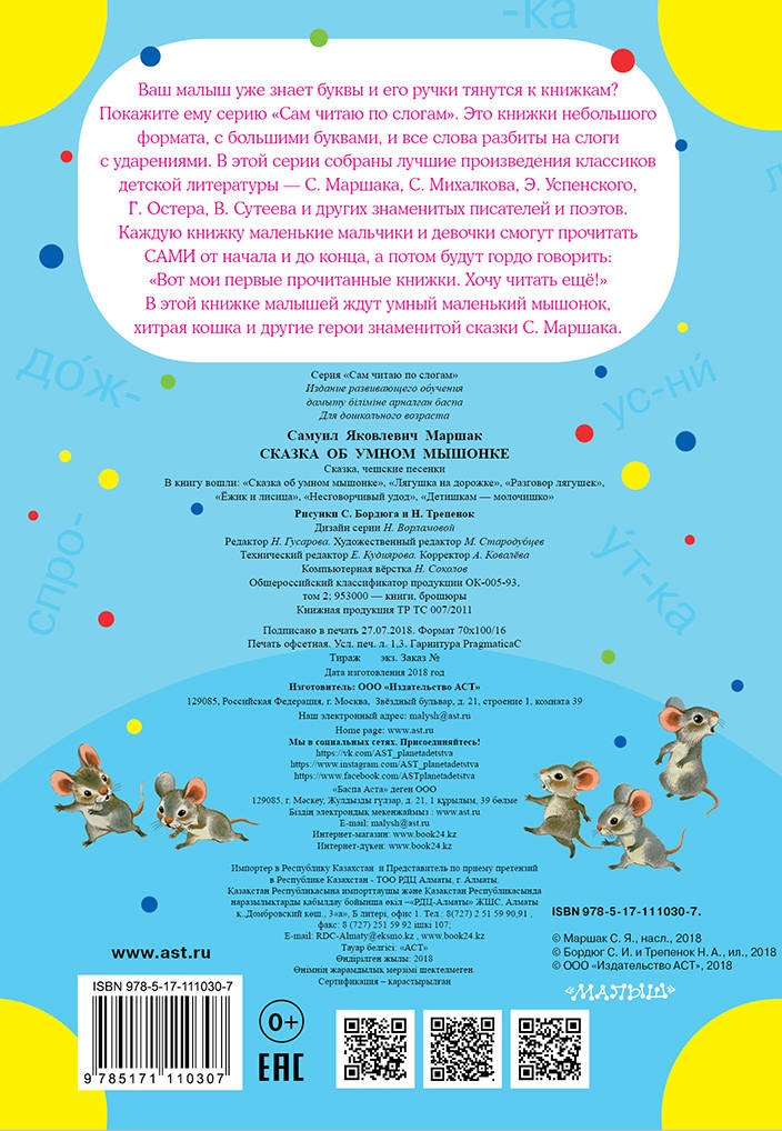 В интернет-магазине Book24.kz можно заказать и купить книгу Сказка об умном мышонке недорого с адресной доставкой по Казахстану. Воспользовавшись нашим сервисом, Вам не придется долго ждать заказ. В течение 1-9 дней товар доставляется в любой город – Актау, Актобе, Атырау, Караганду, Кокшетау, Костанай, Кызылорду, Павлодар, Петропавловск, Талдыкорган, Тараз, Уральск, Усть-Каменогорск, Шымкент, Алматы, Астану и другие. У нас на сайте можно просмотреть фото, ознакомиться с кратким содержанием книги и отзывами читателей. Предлагаем выгодные условия продажи: доступные цены, оперативную доставку. Все книги в наличии.