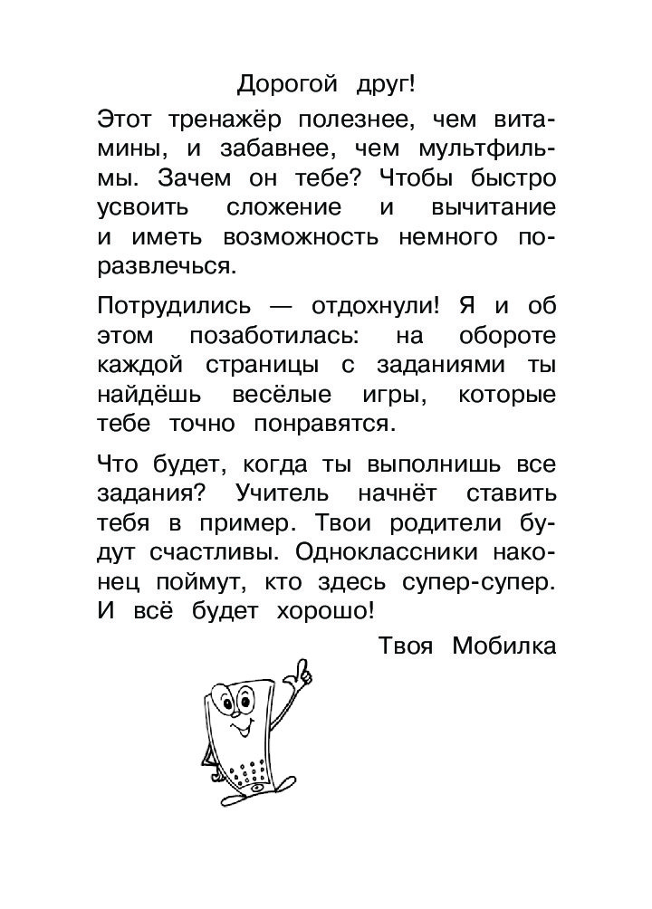В книге приведены не только тренировочные задания, но и творческие, которые позволяют закончить занятие на позитивной ноте и придать ребенку уверенность в своих знаниях. Форма пособия в виде смартфона и веселый персонаж Мобилка создадут игровую атмосферу и превратят занятия в интересный полезный досуг.