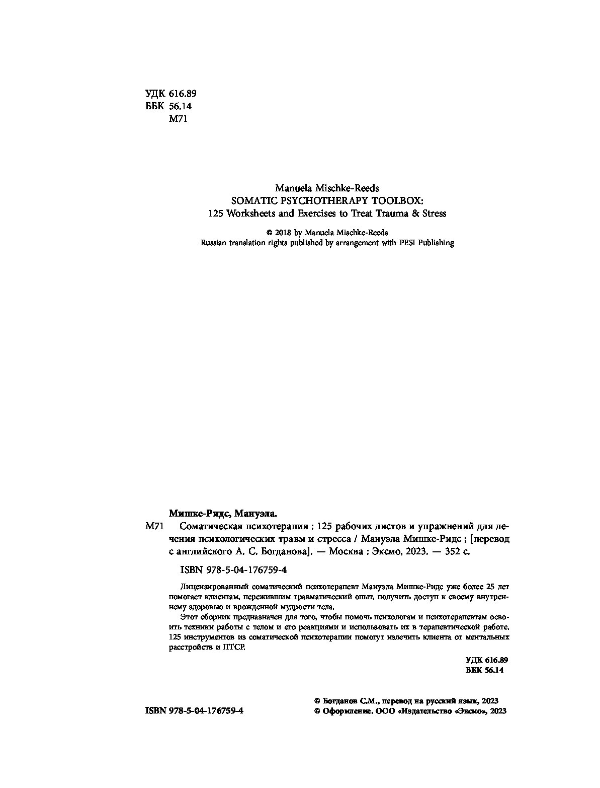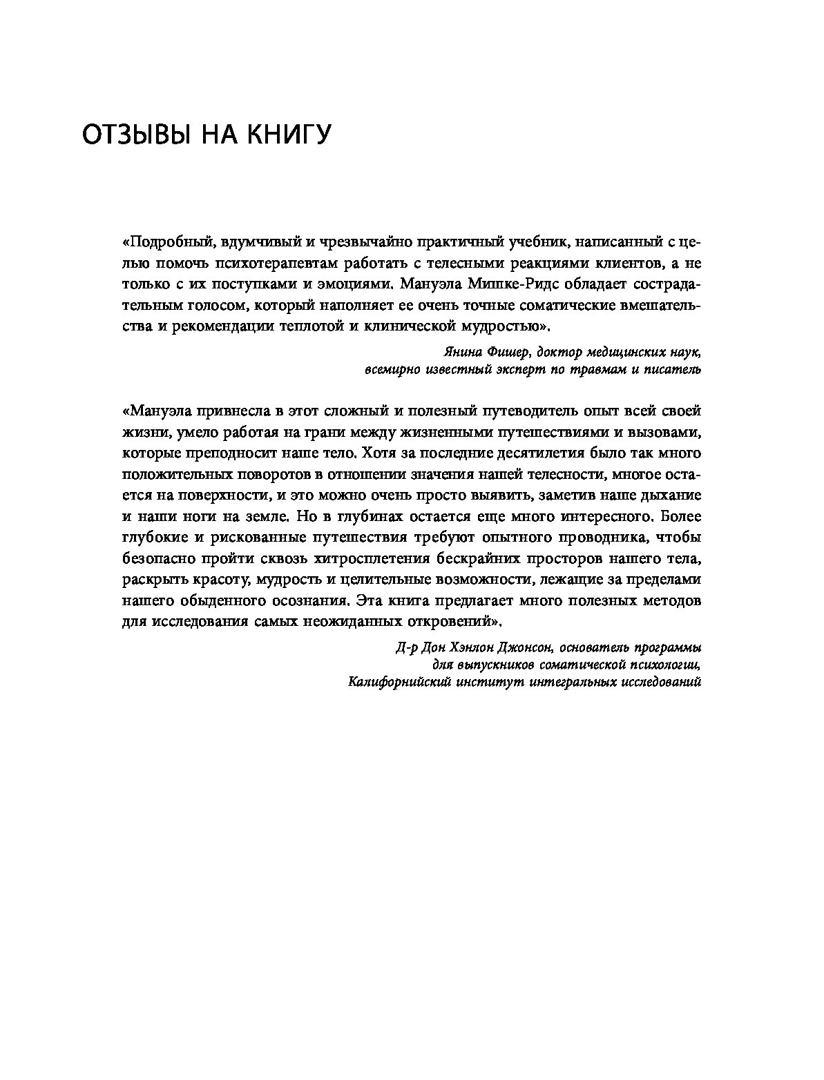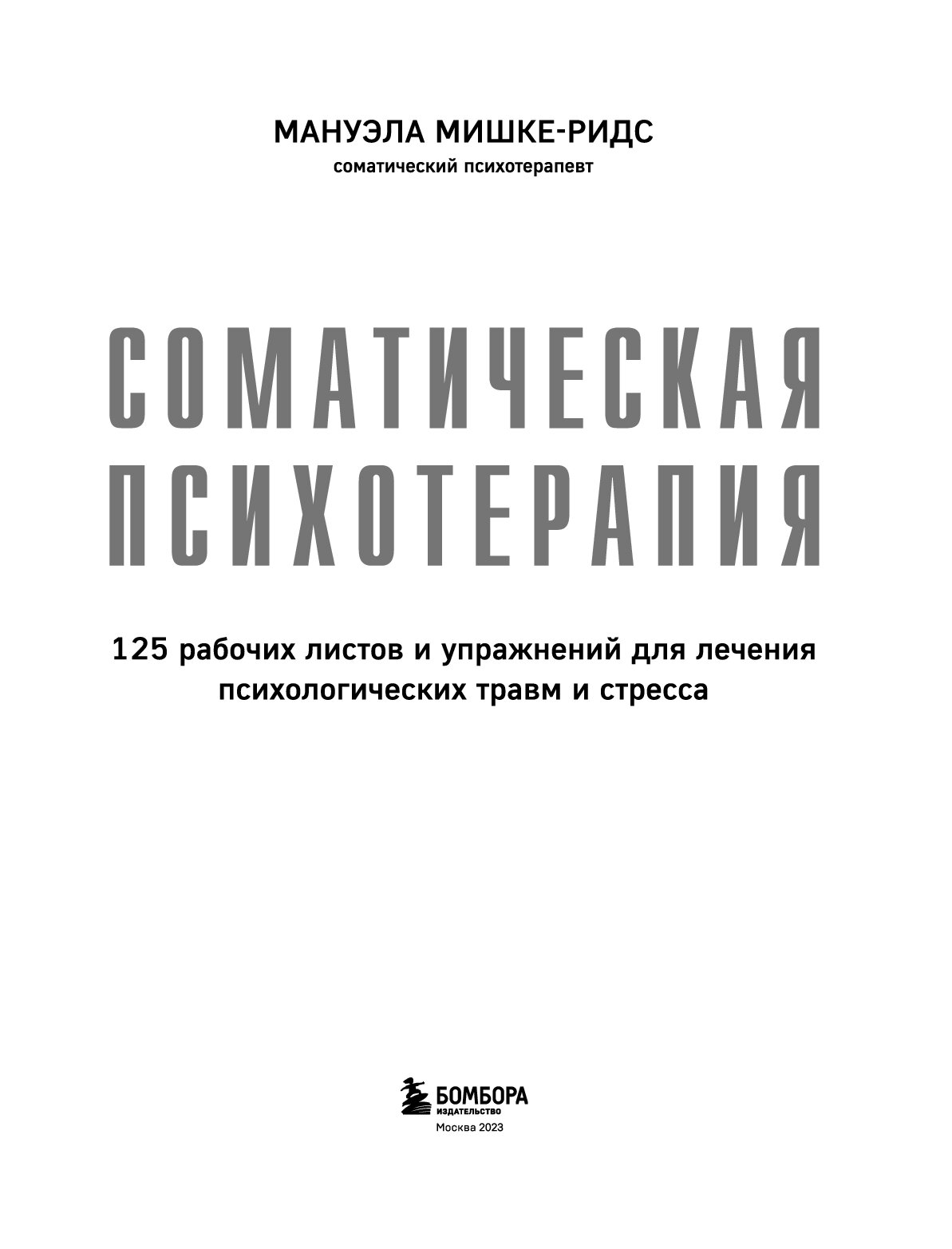 Мануэла Мишке-Ридс, лицензированный соматический психотерапевт с 25-летним клиническим опытом, предлагает 125 инструментов соматической психотерапии, которые помогут психологами и психотерапевтам вернуть клиента к телесной мудрости и излечить от ментальных расстройств и ПТСР.