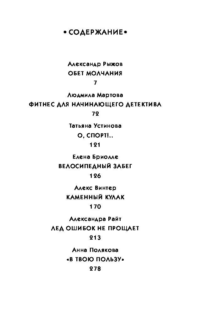 В сборник «Спортивный детектив» вошли рассказы популярных отечественных авторов: Татьяны Устиновой, Анны Поляковой, Людмилы Мартовой — и других мастеров жанра, которые виртуозно переплетают остросюжетную интригу и спортивные достижения. Вы сможете пережить моменты побед и поражений, парадоксальные загадки и опасные ситуации вместе с героями, которые не остановятся ни перед чем, чтобы докопаться до истины.