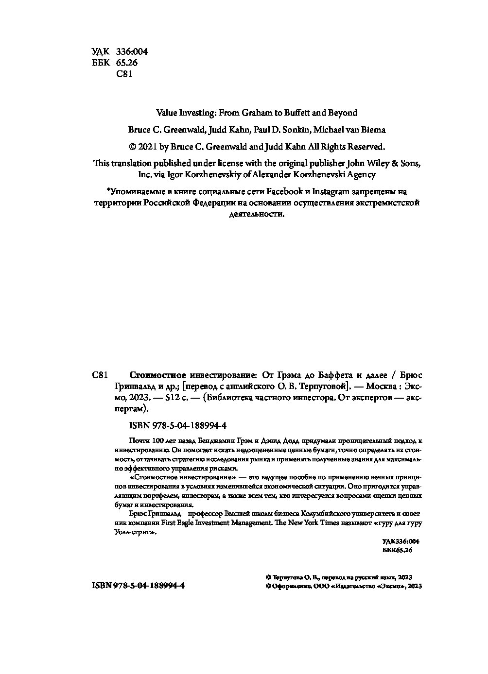 «Стоимостное инвестирование» — это ведущее пособие по применению вечных принципов инвестирования в условиях изменившейся экономической ситуации. Оно пригодится управляющим портфелей, инвесторам, а также всем тем, кто интересуется вопросами оценки ценных бумаг и инвестирования.