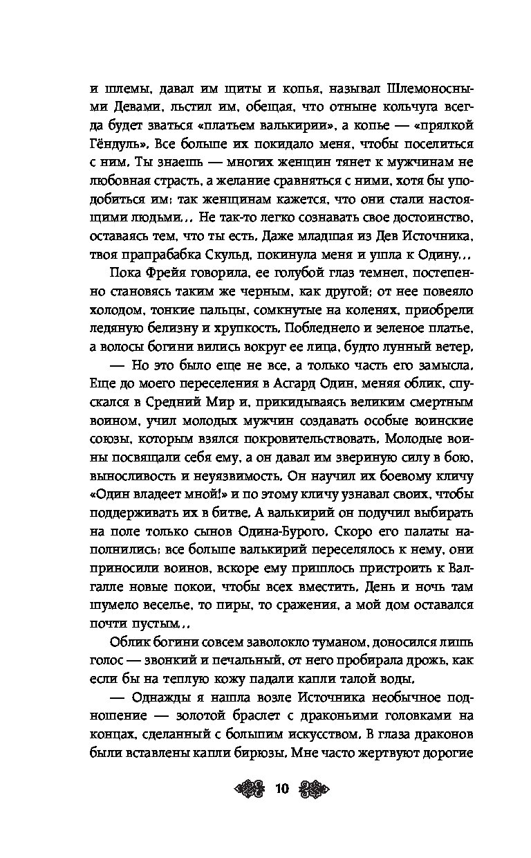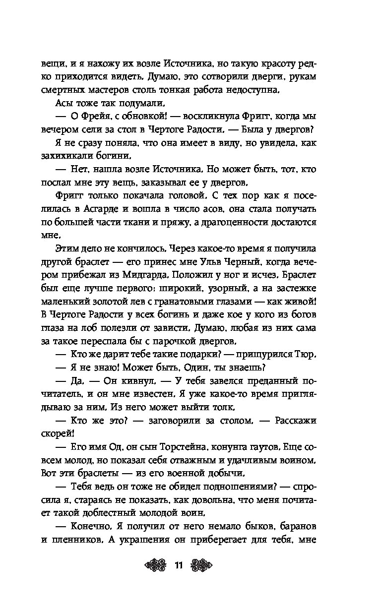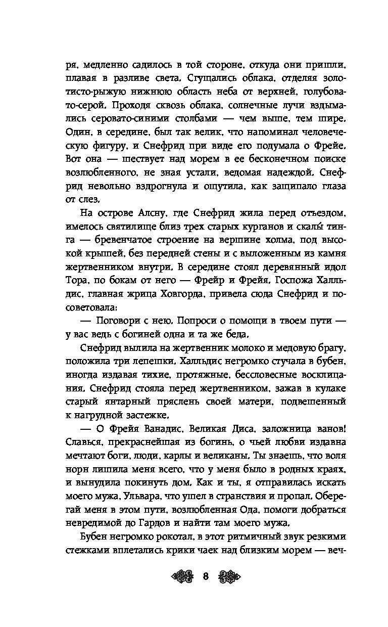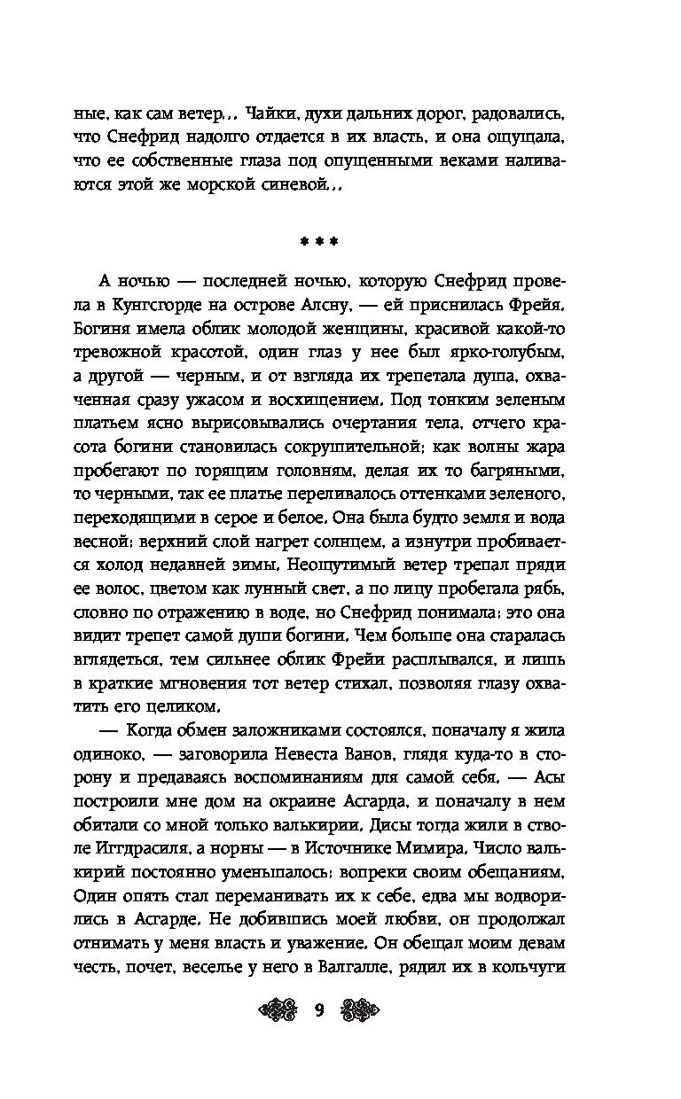 Но судьба Снефрид — лишь поле, на котором разыгрывается очередной круг борьбы Одина и Фрейи, поединок вдохновленного разума с загадкой жизни и любви. История путешествия Снефрид через море, из Швеции на Русь, тесно переплетается с историями из жизни Асгарда, рассказанными самой Фрейей, историями об упорстве женской души в борьбе за любовь.