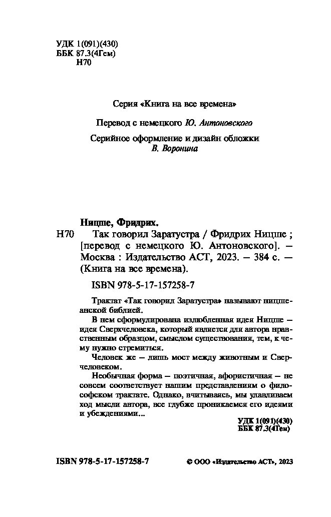«Так говорил Заратустра» — одно из самых популярных произведений Фридриха Ницше. Его идеология о сверхчеловеке послужила фундаментом для современной философии и продолжает оказывать неоценимый вклад в науку, культуру и литературу. Эта книга подойдет как для тех, кто занимается глубоким изучением философии, так и для тех, кто желает найти путь к истинному себе.