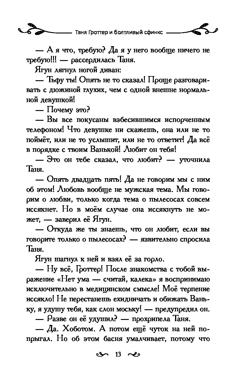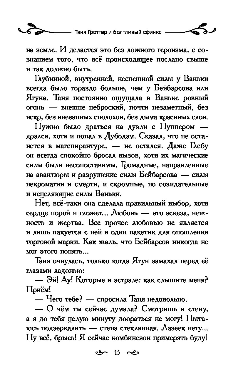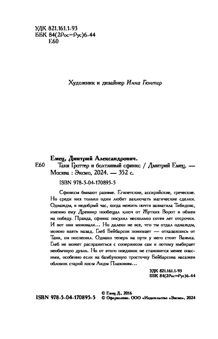Сфинксы бывают разные. Египетские, ассирийские, греческие. Но среди них только один любит заключать магические сделки. Однажды, в недобрый час, когда нежить почти захватила Тибидохс, именно ему Древнир пообещал ключ от Жутких Ворот в обмен на победу. Правда, сфинкс посулил несколько сотен лет отсрочки. И вот они миновали... Но далеко не все, что ты отдал однажды, можно взять назад. Глеб Бейбарсов понимает — отказавшись от Тани, он поспешил. Однако теперь на пути у него стоит Ванька. Глеб не может расправиться с соперником сам и потому выбирает необычную дуэль. Но от этого поединок не становится менее опасным, особенно если на бамбуковую тросточку Бейбарсова насажен обломок старой косы Аиды Плаховны...