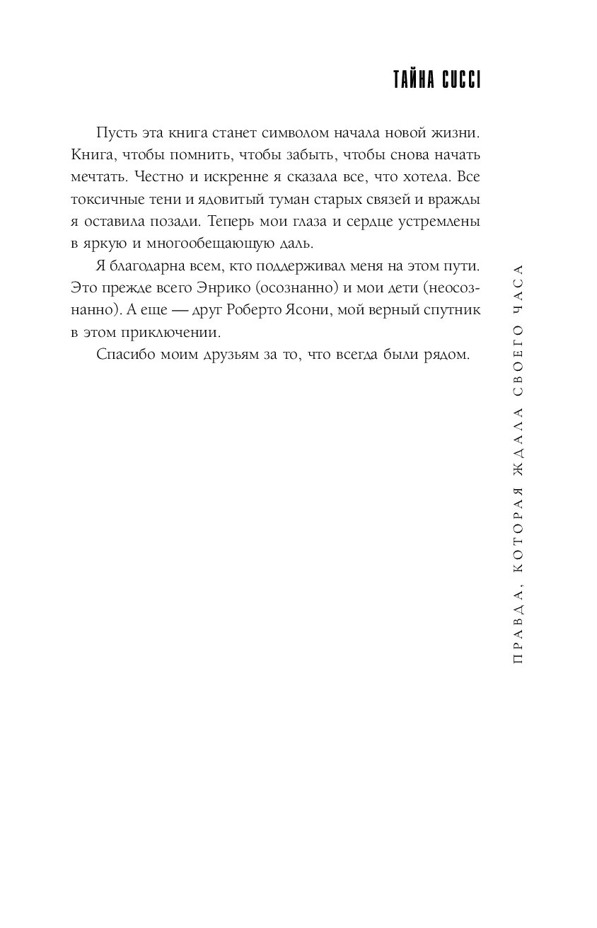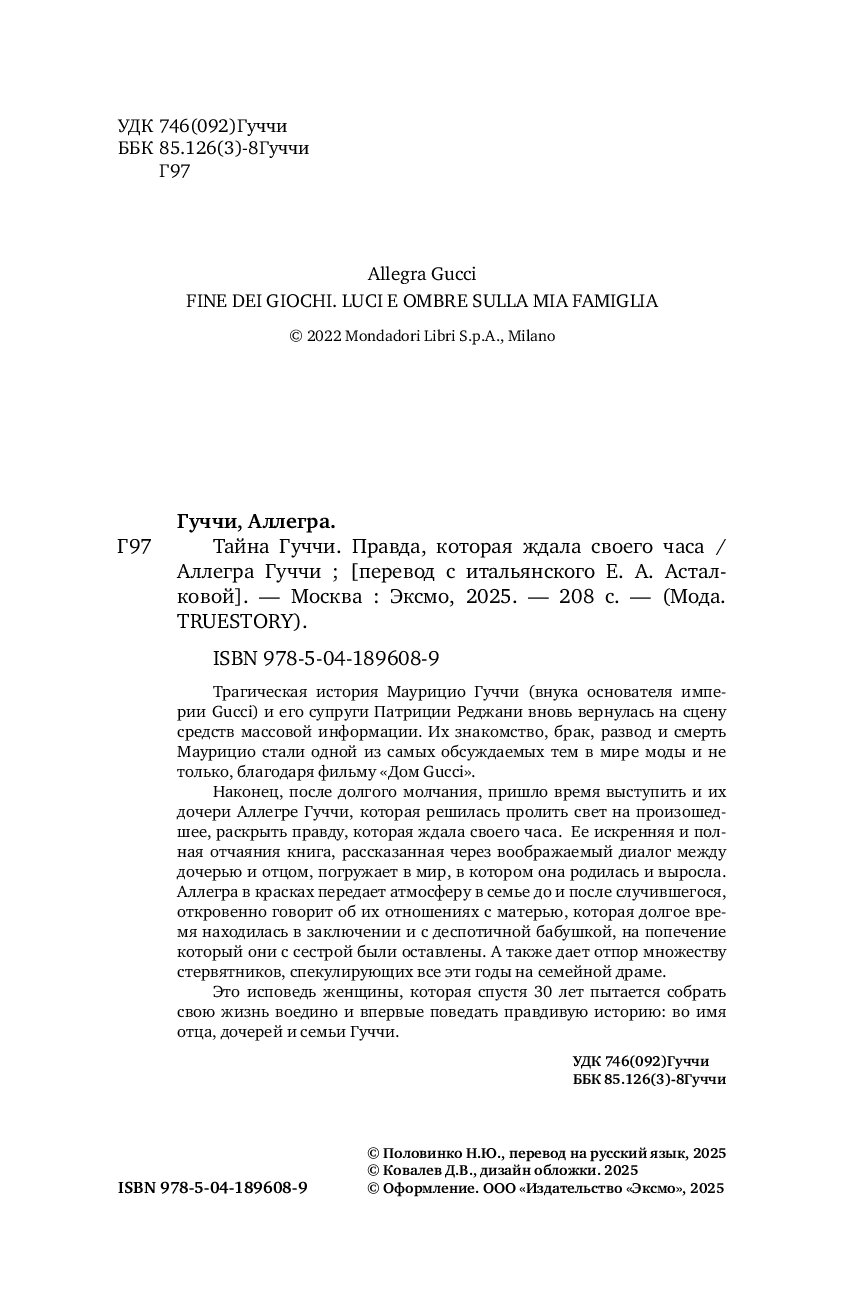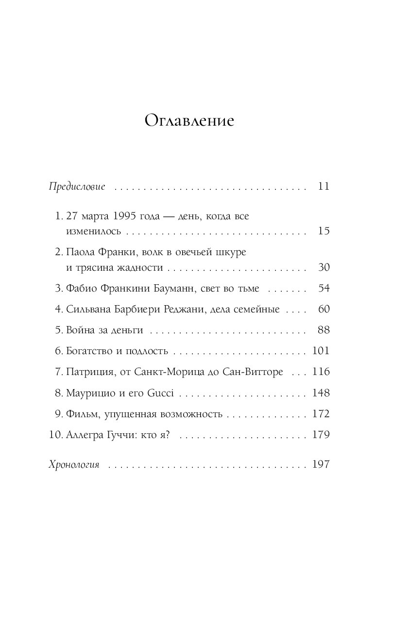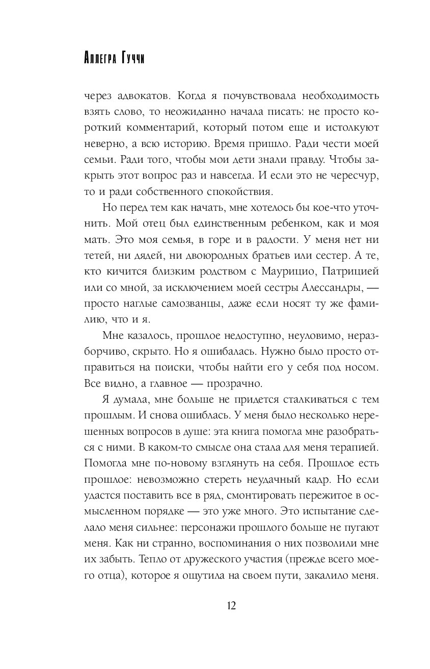 Аллегра Гуччи никогда не давала интервью и публично не обсуждала убийство своего отца Маурицио Гуччи, заказчиком которого была признана ее мать Патриция Реджани. И, возможно, так и не нарушила бы этот своеобразный обет молчания, если бы не фильм Ридли Скотта «Дом Гуччи». Она надеялась, что лента расскажет о династии, их традициях, о создании и развитии бренда. Но сценаристы сконцентрировались на отношениях Маурицио и Патриции, создав очередной остросюжетный блокбастер. Недовольство Аллегры разделили и многие другие, в том числе дизайнер Том Форд. Так на свет появилась эта книга — история полная борьбы, скорби, надежд и разочарований.