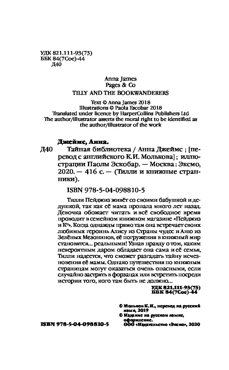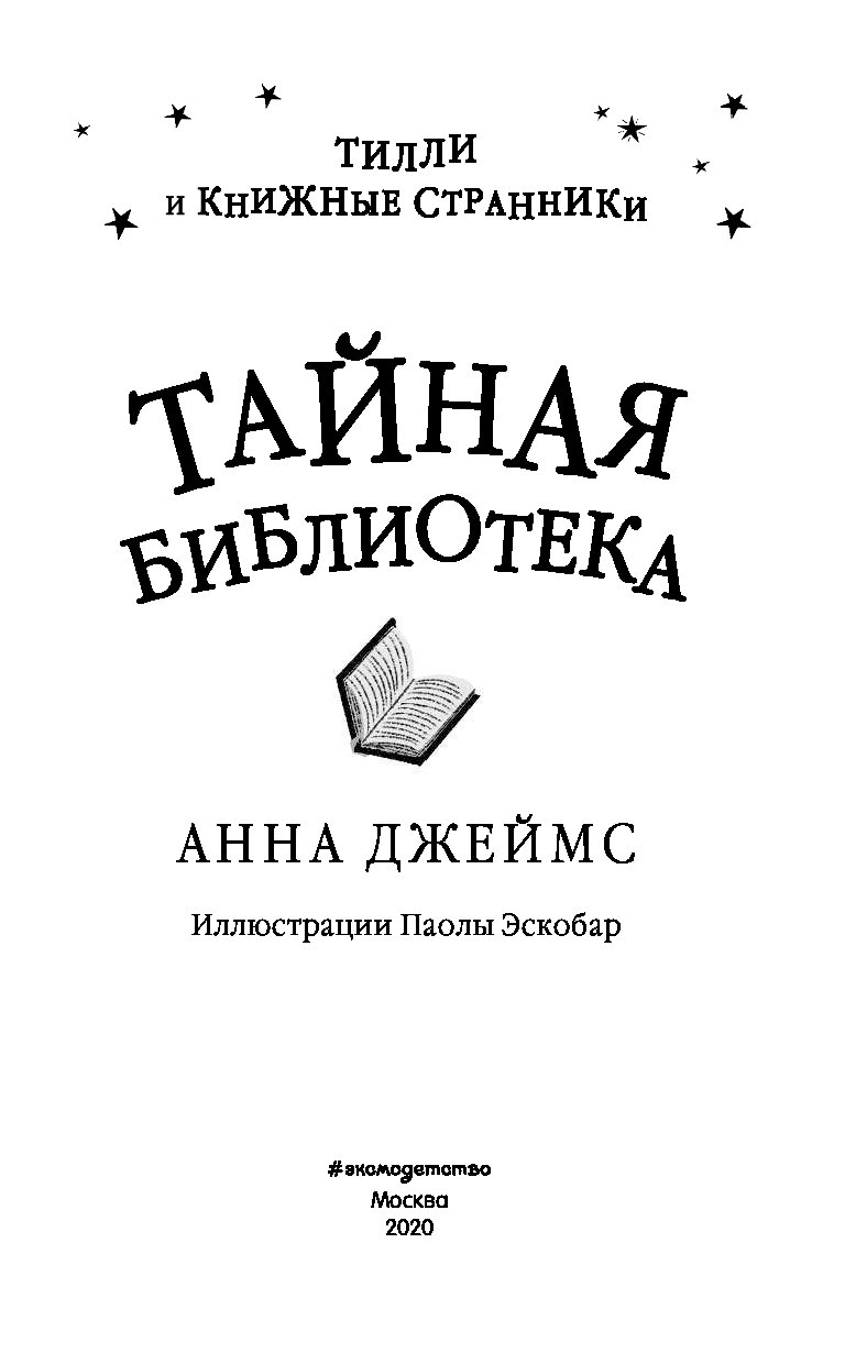 Анна Джеймс — молодая английская писательница, журналистка, пишущая о книгах в различных британских изданиях, в том числе в крупнейшем журнале The Booksellers, а в прошлом — библиотекарь из детской библиотеки. Она попала в число номинантов премии Kim Scott Walwyn Award в 2015 году, а также The London Book Fair Trailblazers Award в 2016-м. Ее первая книга «Тайная библиотека», открывающая серию «Тилли и книжные странники», сразу же попала в шорт-лист престижной британской премии National Book Award. Анна живет в Лондоне, ведет блог на YouTube, посвященный книгам, занимается проведением тематических книжных мероприятий и организацией читательских клубов — вся ее жизнь посвящена книгам, как и ее первые великолепные произведения.