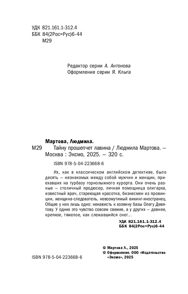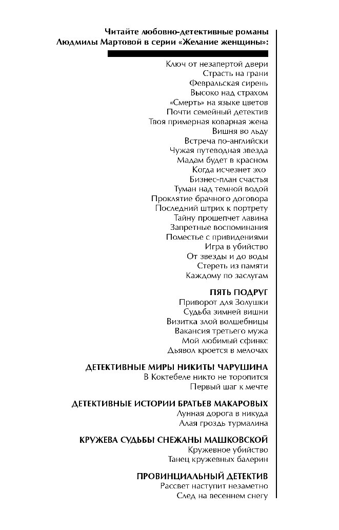Людмила Мартова — мастер увлекательной детективной мелодрамы, автор захватывающих остросюжетных историй. Их отличают закрученная детективная интрига, лихой финал с неожиданной развязкой и, конечно же, яркая любовная линия. Героини романов Людмилы Мартовой — современные молодые женщины, которые точно знают, чего хотят от жизни.