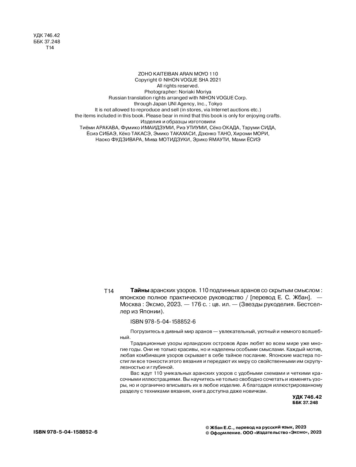 «Глубокое во всех отношениях руководство. Чисто японская интерпретация аранов, пропитанная духом ирландского побережья. "Перевернутая чайка", "Поцелуй камня Красноречия", "Жемчужный узор" — настоящая поэзия пряжи!» — Юрие Мита, модельер