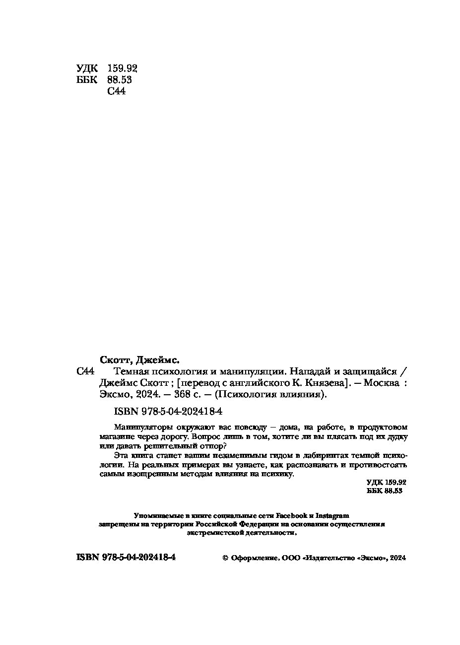 Джеймс Скотт, профессор Чикагского университета, собрал воедино все разрушительные способы воздействия — от обмана до газлайтинга и макиавеллизма. Автор приводит множество реальных примеров и научных исследований, а еще демонстрирует, как темная психология применяется в различных контекстах — личных отношениях, корпоративных интригах и политической борьбе. Особое внимание он уделяет тому, как противостоять манипуляциям, защищать себя от агрессивного воздействия и сохранять психологическую устойчивость.