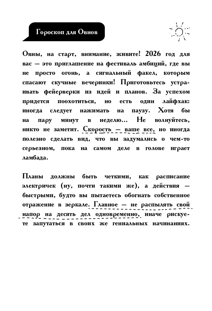 Ваша астрологическая миссия-2026: научиться радоваться переменам, а не только расставлять все вещи по алфавиту и цвету. Резкие скачки? Не бойтесь — на случай внезапных изменений всегда держите под рукой персональный запас валерьянки. В этом году жизнь будет подкидывать вам столько поводов для саморазвития, что захочется завести отдельный чек-лист «Чего я еще не попробовал… сегодня».