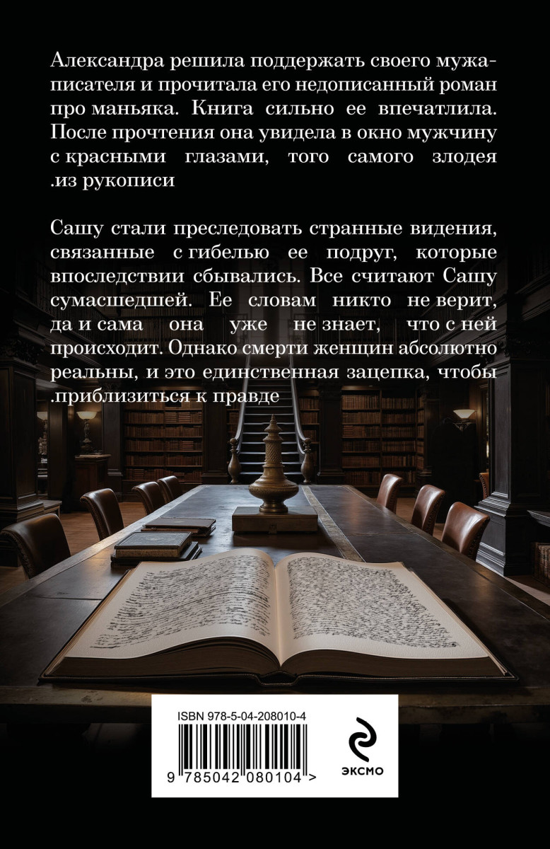 Александра решила поддержать своего мужа-писателя и прочитала его недописанный роман про маньяка. Книга сильно ее впечатлила. После прочтения она увидела в окно мужчину с красными глазами, того самого злодея из рукописи. Сашу стали преследовать странные видения, связанные с гибелью ее подруг, которые впоследствии сбывались. Все считают Сашу сумасшедшей, ее словам никто не верит, да и сама она уже не знает, что с ней происходит, но смерти женщин абсолютно реальны, и это единственная зацепка, чтобы приблизиться к правде.
