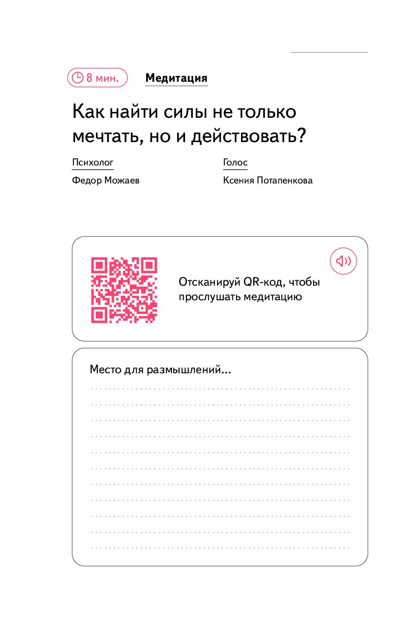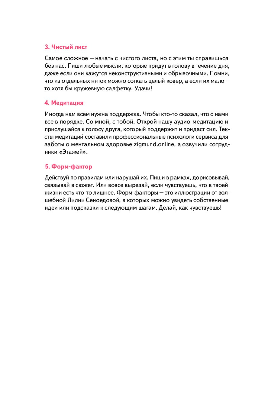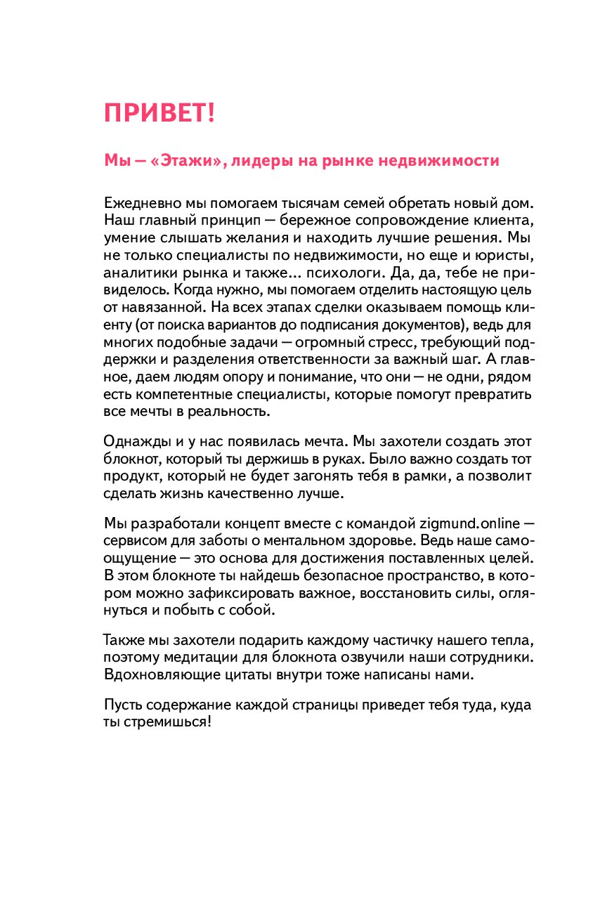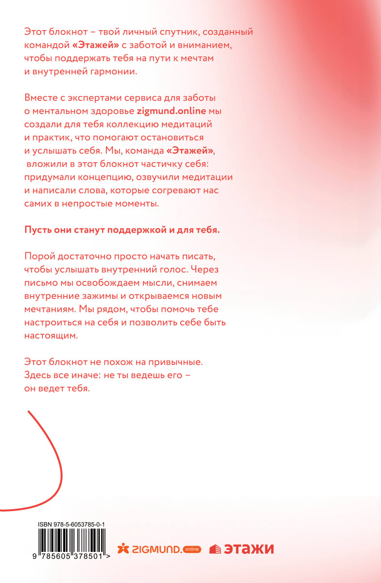 Вместе с экспертами сервиса для заботы о ментальном здоровье zigmund.online мы создали для тебя коллекцию медитаций и практик, что помогают остановиться и услышать себя. Мы, команда «Этажей», вложили в этот блокнот частичку себя: придумали концепцию, озвучили медитации и написали слова, которые согревают нас самих в непростые моменты.