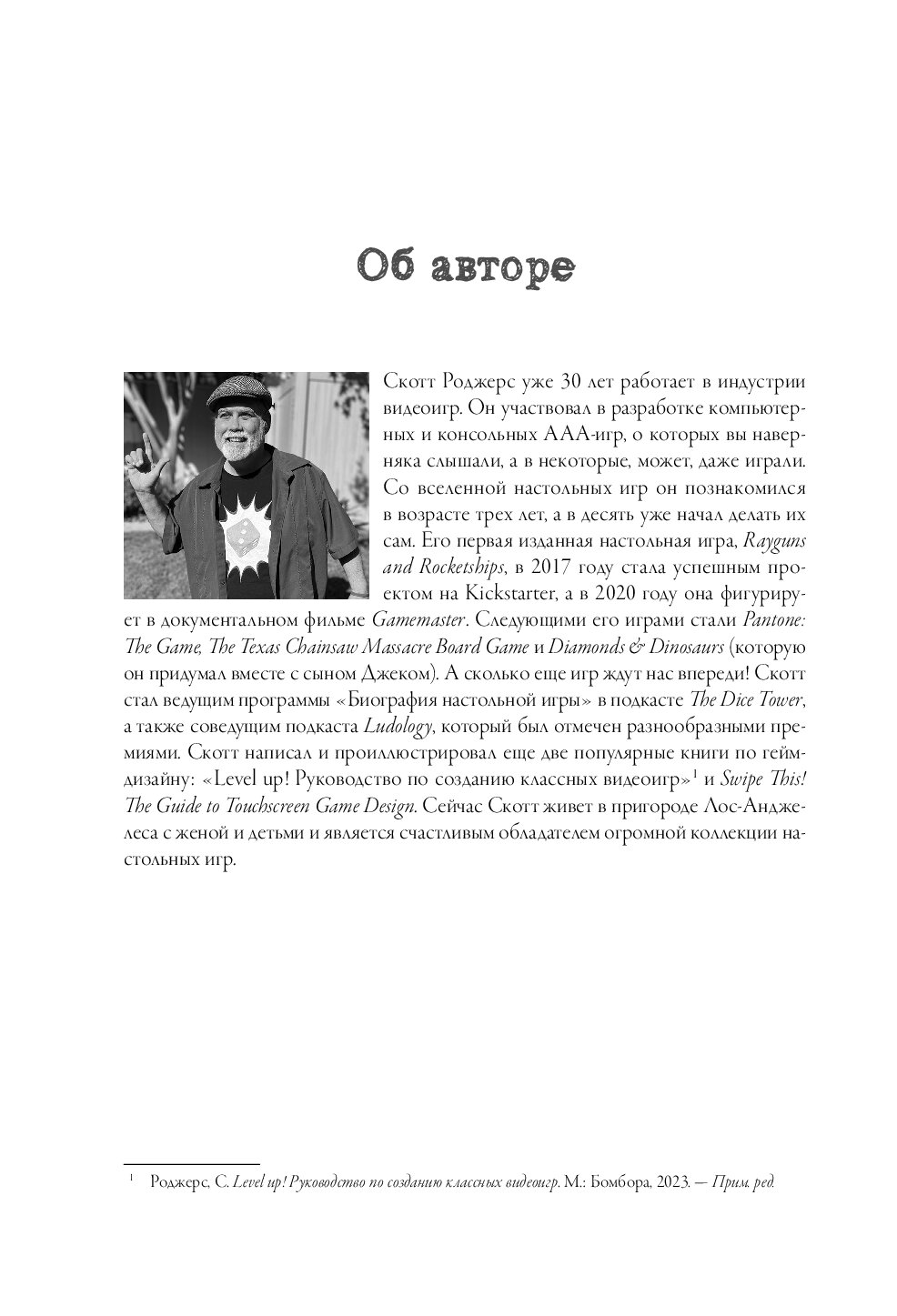 Скотт Роджерс — профессиональный гейм-дизайнер с 30-летним опытом. Разработал множество настольных игр, включая Rayguns and Rocketships, Pantone: The Game, ALIEN: Fate of the Nostromo и игры по франшизе Marvel. Автор бестселлера «Level up! Руководство по созданию классных видеоигр».