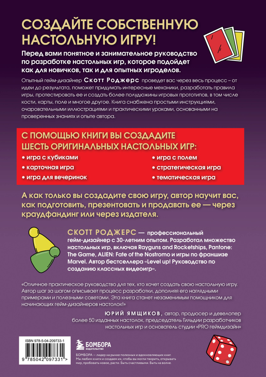 Опытный гейм-дизайнер Скотт Роджерс проведет вас через весь процесс от идеи до результата, поможет придумать интересные механики, разработать правила игры, протестировать ее и создать более полудюжины игровых прототипов, в том числе кости, карты, поле и многое другое. Книга снабжена простыми инструкциями, очаровательными иллюстрациями и практическими уроками, основанными на проверенных знаниях и опыте автора.
