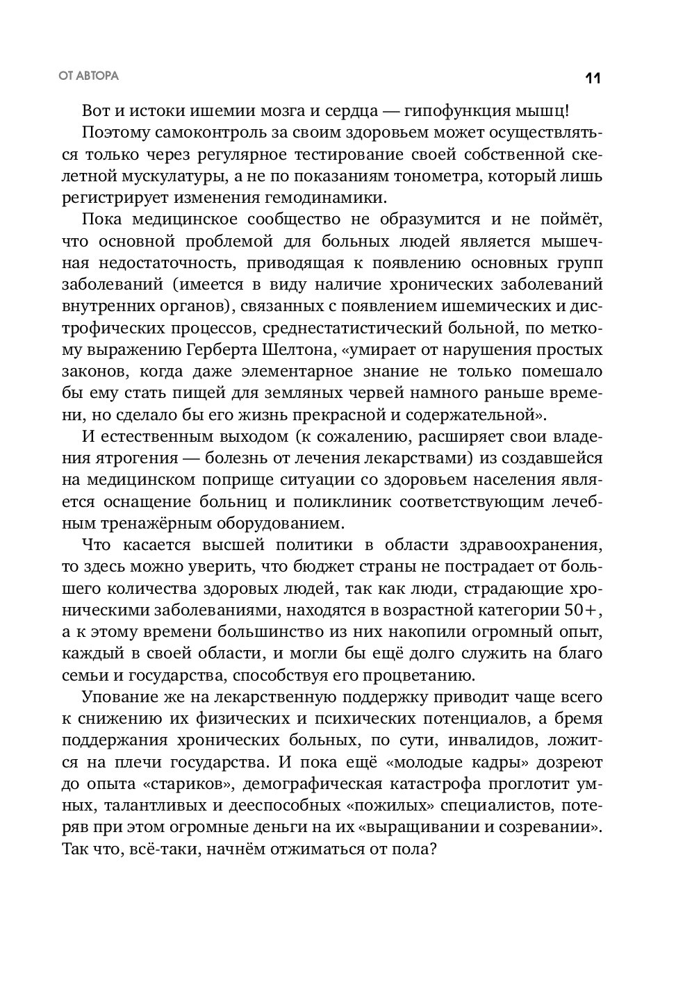 Три этажа здоровья. Три ключевых зоны поражения органов и систем. Чтобы не стать жертвой «времени», чтобы не потерять имеющихся возможностей, чтобы всегда заниматься тем, что дорого и что нравится, надо правильно следить за своим телом. В этой книге собраны 100 идеальных упражнений, которые можно делать дома и в зале в любом возрасте. Результат: здоровое сердце, крепкие суставы, минимизация травм, связанных с падениями. Крепкое и здоровое тело на всю жизнь.