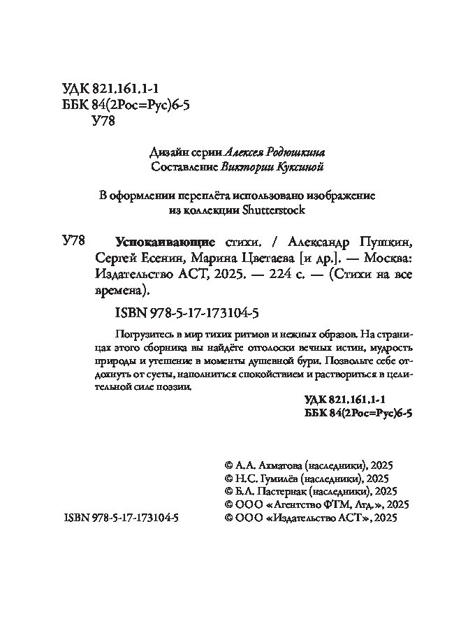 В интернет-магазине Book24.kz можно купить книгу Успокаивающие стихи с адресной доставкой по РК. Наш сервис – это прекрасная возможность сэкономить деньги и время, ведь вам не придется искать необходимое издание в обычных книжных магазинах. К тому же, мы предлагаем книгу [название книги] недорого. Доступные цены сохраняем за счет того, что напрямую сотрудничаем с издательствами. Вы без труда можете заказать интересующую книгу в Алматы, Астану, Актау, Актобе, Атырау, Караганду, Кокшетау, Костанай, Кызылорду, Павлодар, Петропавловск, Талдыкорган, Тараз, Уральск, Усть-Каменогорск, Шымкент, и другие города. Чтобы оформить заказ, нужно связаться с нашим менеджером по телефону или заполнить заявку онлайн.