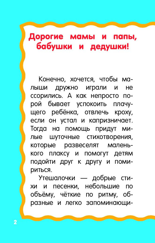 Утешалочки — добрые стихи и песенки, небольшие по объёму, чёткие по ритму, образные и легко запоминающиеся. Ласковый мамин голос и весёлая рифмовка развеселят малыша и подарят хорошее настроение. Добрые стихи обязательно понравятся малышам, ведь их рассказывают мамы-волшебницы, которые очень любят своих деток и хотят, чтобы те росли радостными и счастливыми, не хныкали, а улыбались.