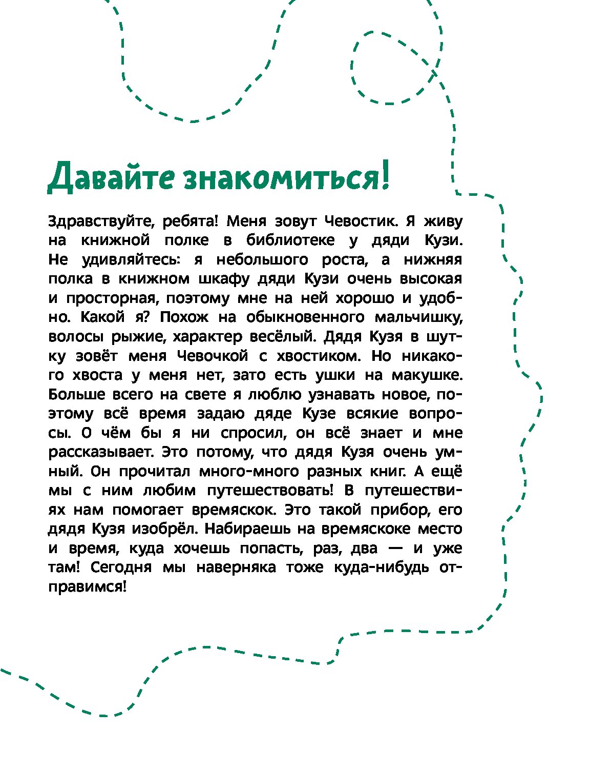 Что такое фотосинтез? Могут ли клетки дышать? Что общего между бактериями и дождевыми червями? Почему скисает молоко? В новой книге серии детских энциклопедий Чевостик и дядя Кузя познакомятся с увлекательным миром биологии. Они узнают, какие бывают живые организмы и как они развивались на Земле на протяжении веков. А ещё выяснят, как устроена клетка растения, могут ли живые существа выжить без солнца, научились ли люди создавать новые виды животных и растений и какое место в природе занимает человек. Кто такой Чевостик? Чевостик — симпатичный герой из известного аудиопроекта. Сегодня ребята знают его по энциклопедиям. В серии продолжают выходить книги, которые объясняют ребенку устройство мира. Дети гораздо лучше воспринимают информацию, когда о мире им рассказывает какой-нибудь сказочный персонаж. Именно поэтому девчонки и мальчишки так любят подобные энциклопедии. Чевостик вместе с дядей Кузей совершает удивительные путешествия в мир наук: физики, химии, астрономии, анатомии, геологии и других. Он рассказывает детям о великих географических открытиях, покорении космоса и волшебных химических превращениях. Для кого эта книга Для любознательных детей от 6 лет Для всех-всех фанатов Чевостика Для дошкольников и младших школьников