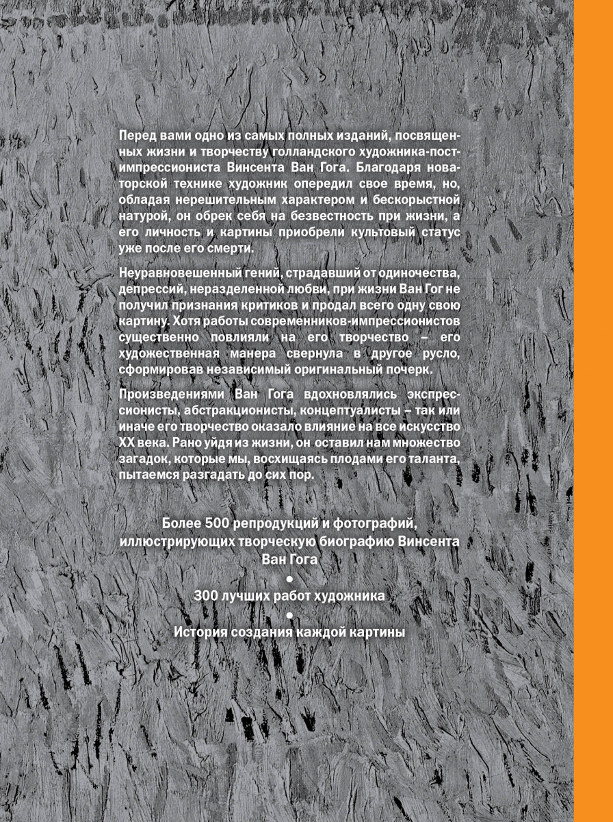 Подробная биография Ван Гога сопровождена фотографиями из личного архива художника, фамильными документами, а также множеством репродукций его работ в том числе: картин, набросков.