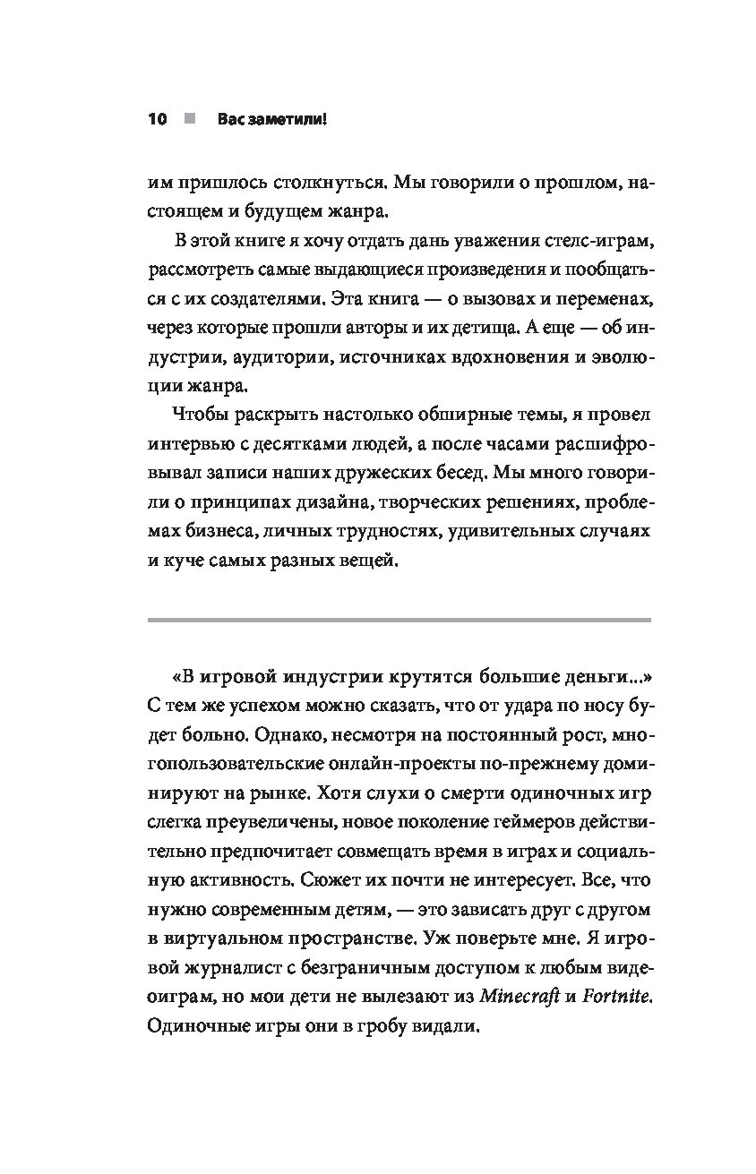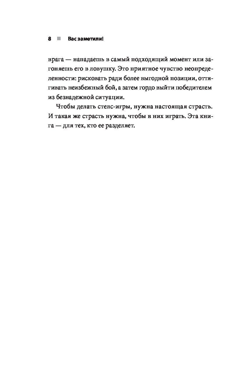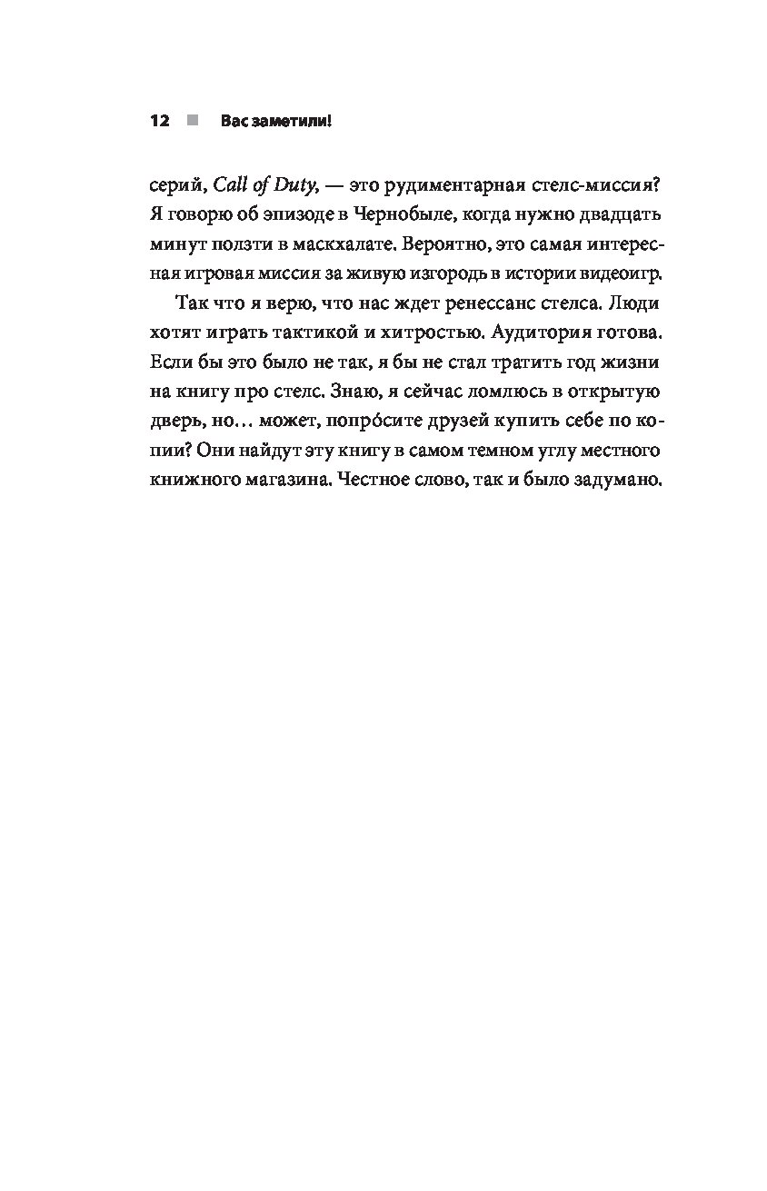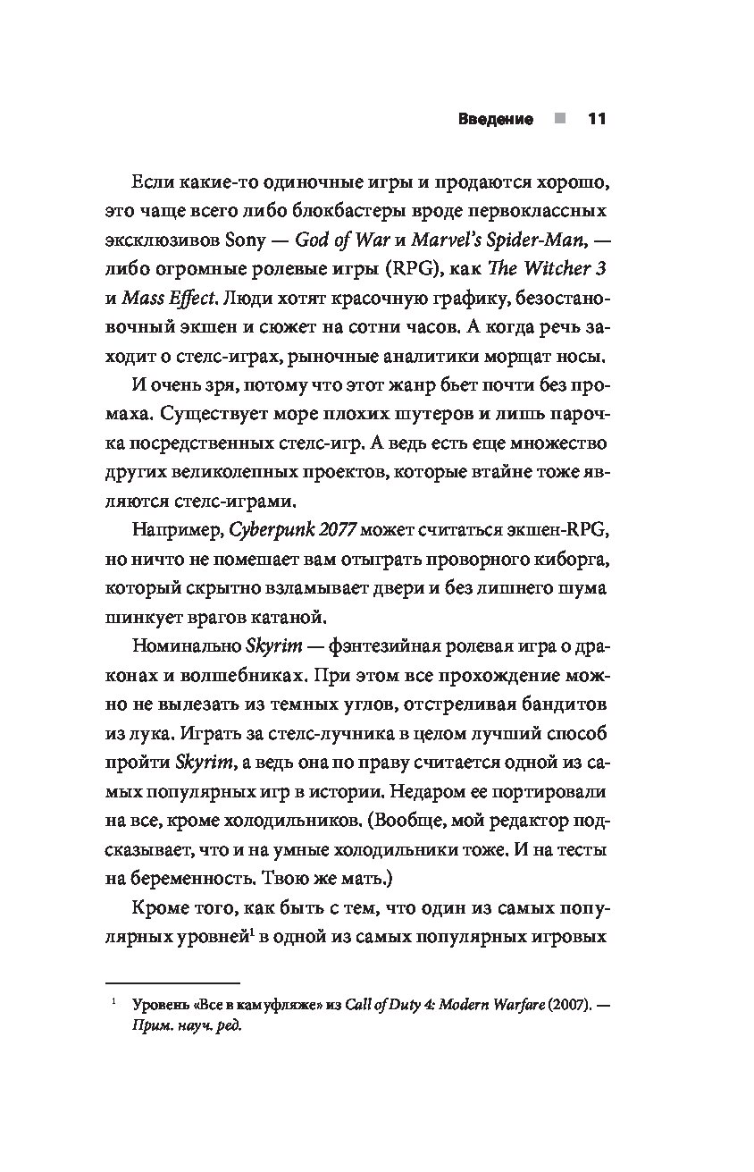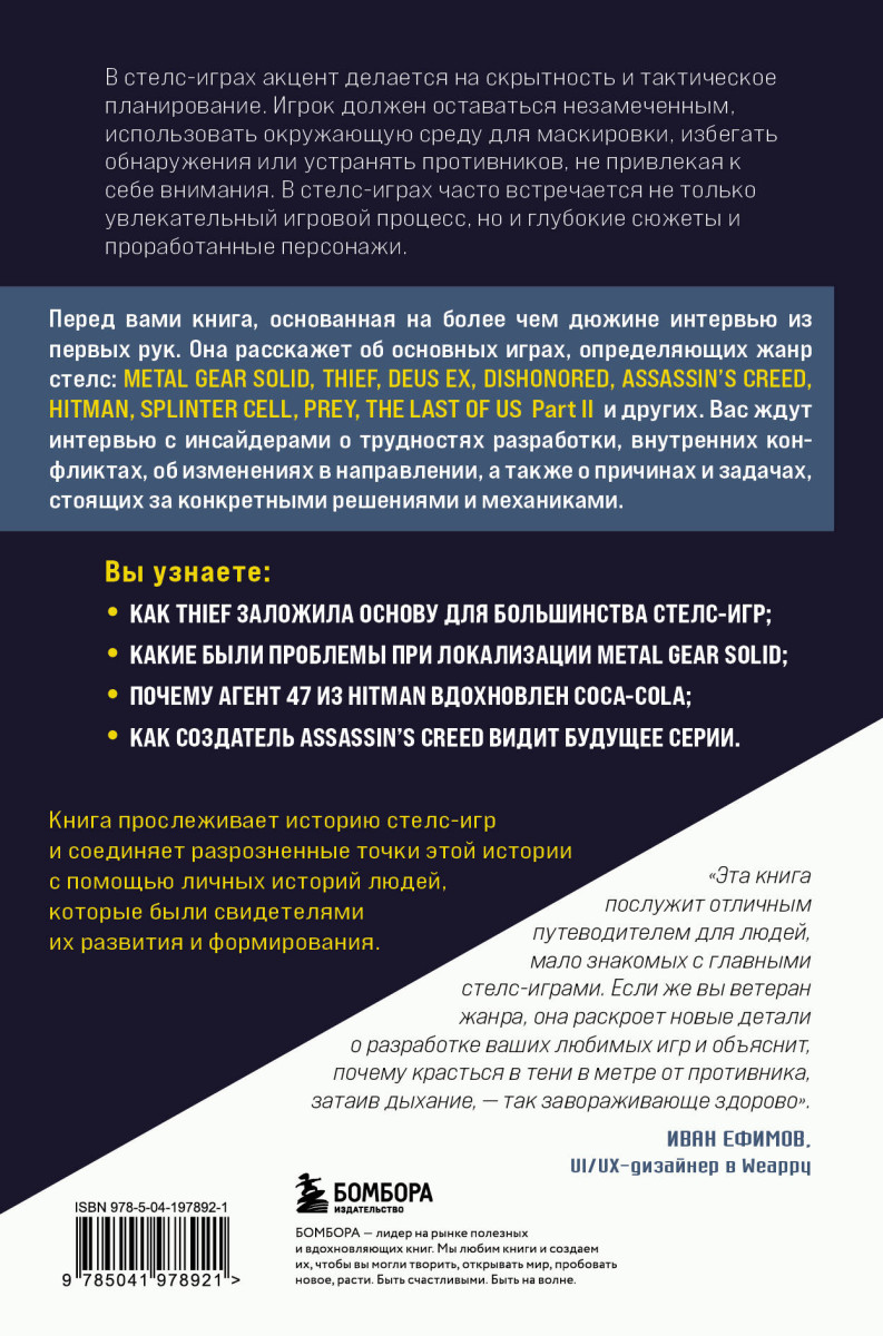 «Эта книга послужит отличным путеводителем для людей, мало знакомых с главными стелс-играми. Если же вы ветеран жанра, она раскроет новые детали о разработке ваших любимых игр и объяснит, почему красться в тени в метре от противника, затаив дыхание, — так завораживающе здорово». — Иван Ефимов, UI/UX-дизайнер в Weappy