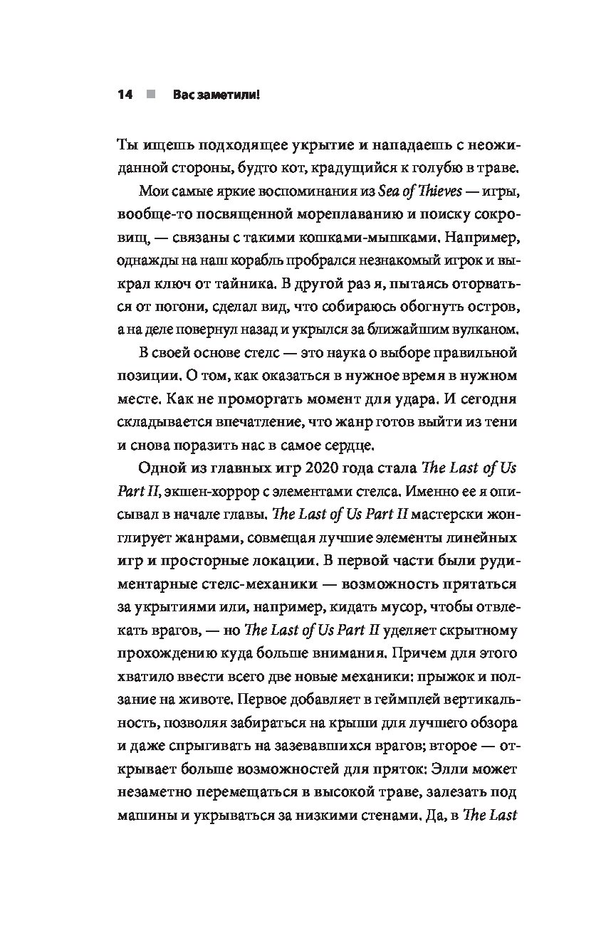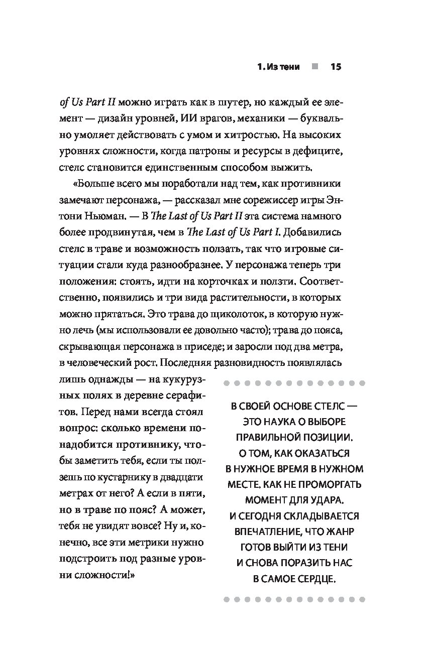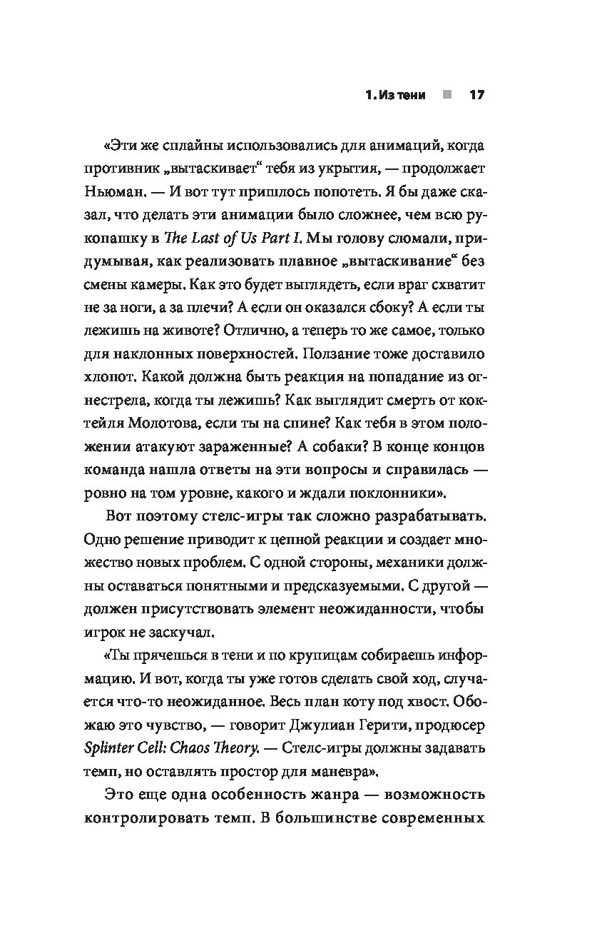 Перед вами книга, основанная на более чем дюжине интервью из первых рук. Она расскажет об основных играх, определяющих жанр стелс: Metal Gear Solid, Thief, Deus Ex, Dishonored, Assassin’s Creed, Hitman, Splinter Cell, Prey, The Last of Us Part II и других. Вас ждут интервью с инсайдерами о трудностях разработки, внутренних конфликтах, об изменениях в направлении, а также о причинах и задачах, стоящих за конкретными решениями и механиками.