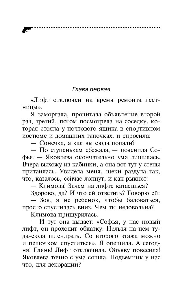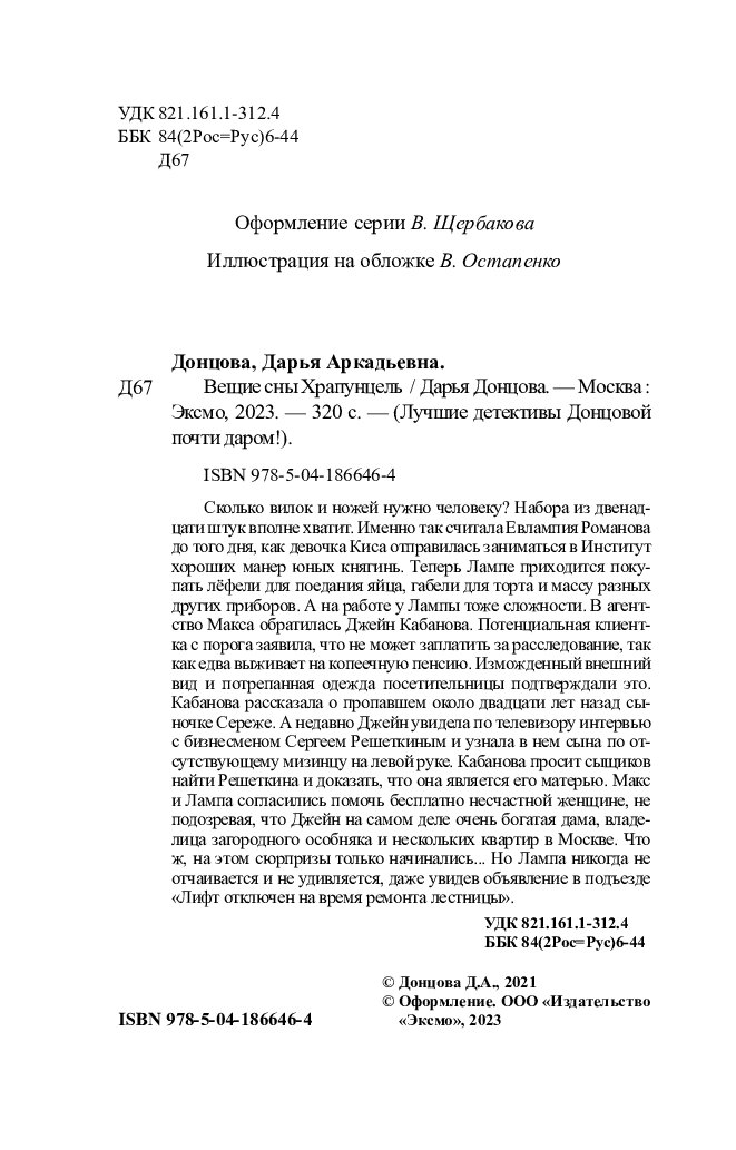 Сколько вилок и ножей нужно человеку? Набора из двенадцати штук вполне хватит. Именно так считала Евлампия Романова до того дня, как девочка Киса отправилась заниматься в Институт хороших манер юных княгинь. Теперь Лампе приходится покупать лёфели для поедания яйца, габели для торта и массу разных других приборов. А на работе у Лампы тоже сложности. В агентство Макса обратилась Джейн Кабанова. Потенциальная клиентка с порога заявила, что не может заплатить за расследование, так как едва выживает на копеечную пенсию. Изможденный внешний вид и потрепанная одежда посетительницы подтверждали это. Кабанова рассказала о пропавшем около двадцати лет назад сыночке Сереже. А недавно Джейн увидела по телевизору интервью с бизнесменом Сергеем Решеткиным и узнала в нем сына по отсутствующему мизинцу на левой руке. Кабанова просит сыщиков найти Решеткина и доказать, что она является его матерью. Макс и Лампа согласились помочь бесплатно несчастной женщине, не подозревая, что Джейн на самом деле очень богатая дама, владелица загородного особняка и нескольких квартир в Москве. Что ж, на этом сюрпризы только начинались... Но Лампа никогда не отчаивается и не удивляется, даже увидев объявление в подъезде «Лифт отключен на время ремонта лестницы».