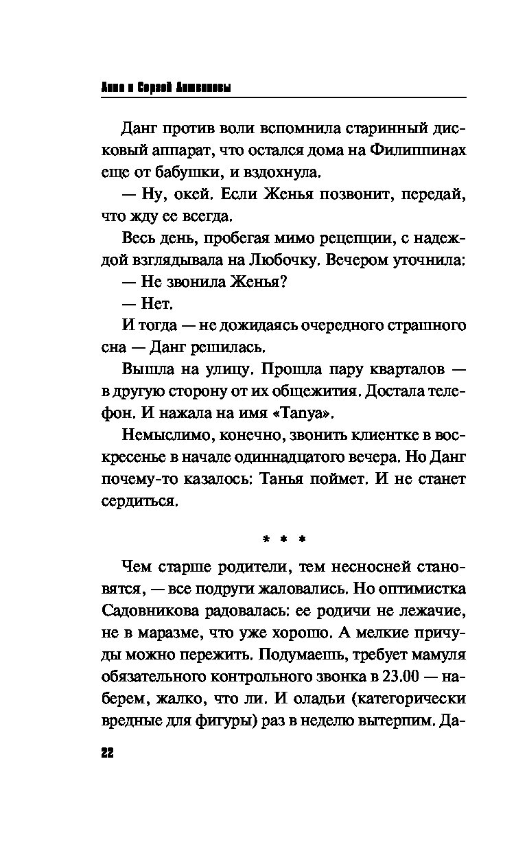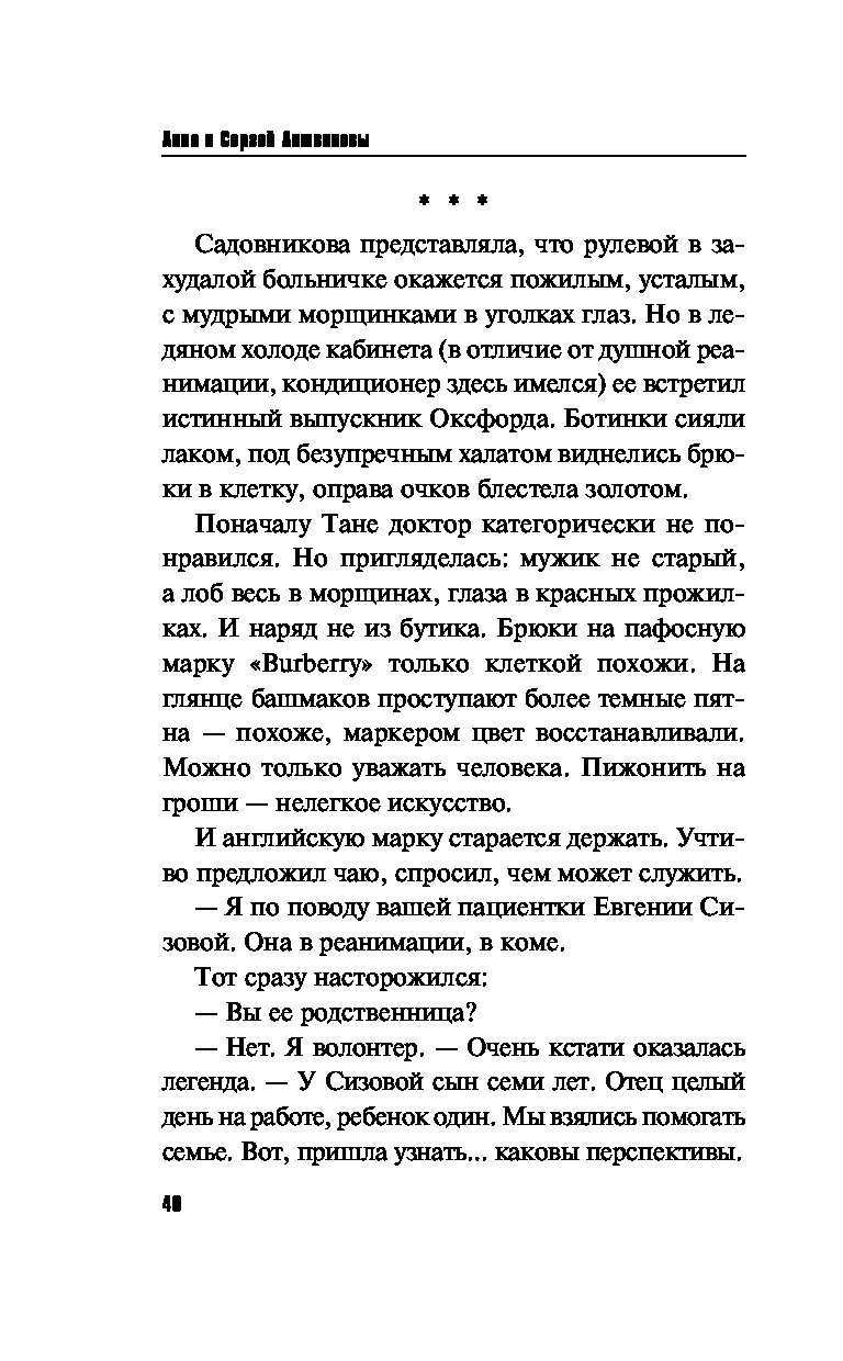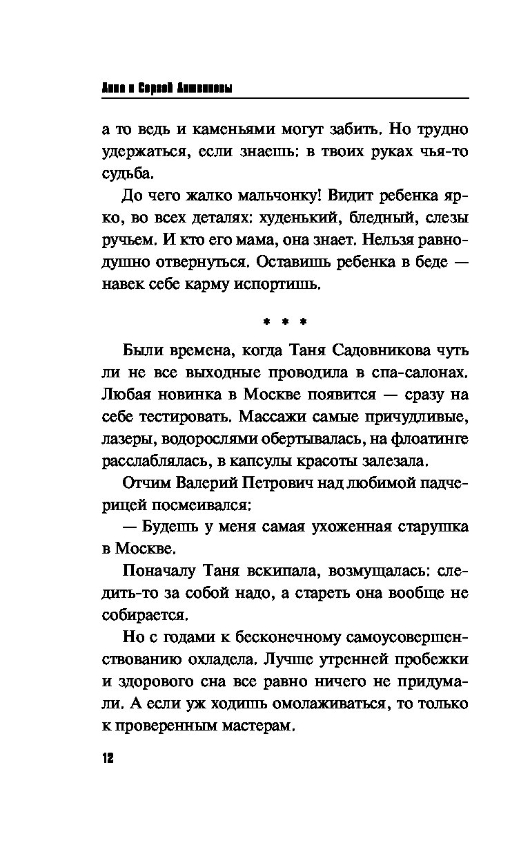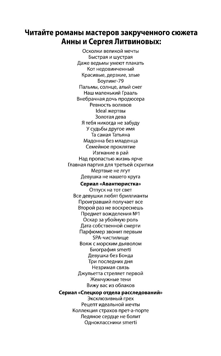 Закрученная интрига, понятные и близкие читателю персонажи, современные проблемы — вот секрет успеха хорошего детектива за авторством Литвиновых. Следствие вновь ведут хорошо известные читателям по романам и телесериалам герои — авантюристка Татьяна Садовникова и ее отчим, отставной полковник внешней разведки Валерий Ходасевич.