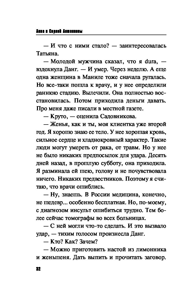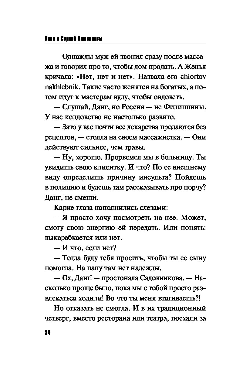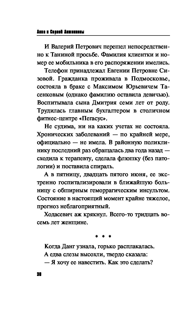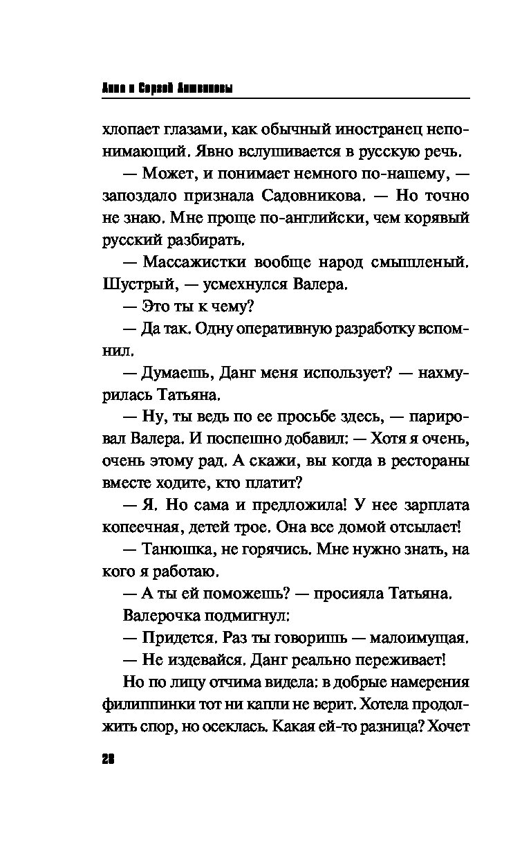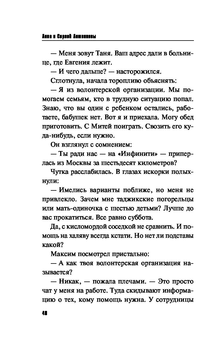 Закрученная интрига, понятные и близкие читателю персонажи, современные проблемы — вот секрет успеха хорошего детектива за авторством Литвиновых. Следствие вновь ведут хорошо известные читателям по романам и телесериалам герои — авантюристка Татьяна Садовникова и ее отчим, отставной полковник внешней разведки Валерий Ходасевич.
