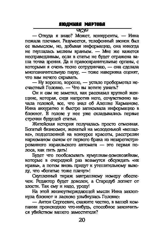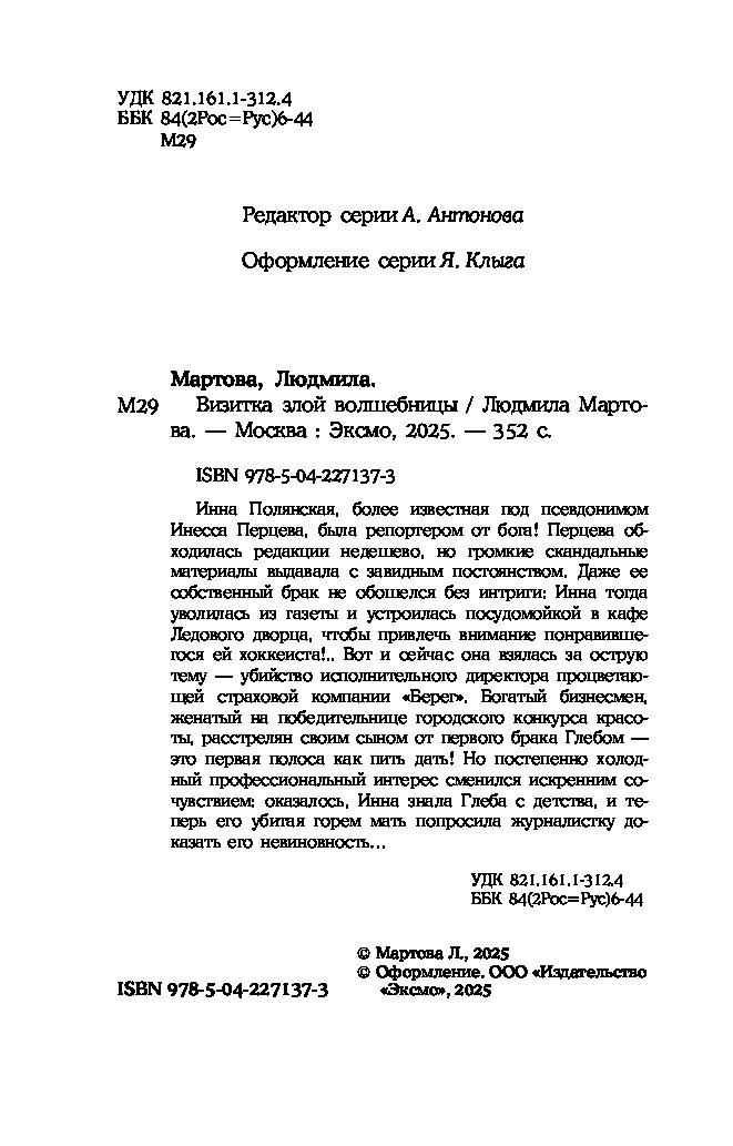 Людмила Мартова — мастер увлекательной детективной мелодрамы, автор захватывающих остросюжетных историй. Их отличают закрученная детективная интрига, лихой финал с неожиданной развязкой и, конечно же, яркая любовная линия. Героини романов Людмилы Мартовой — современные молодые женщины, которые точно знают, чего хотят от жизни.